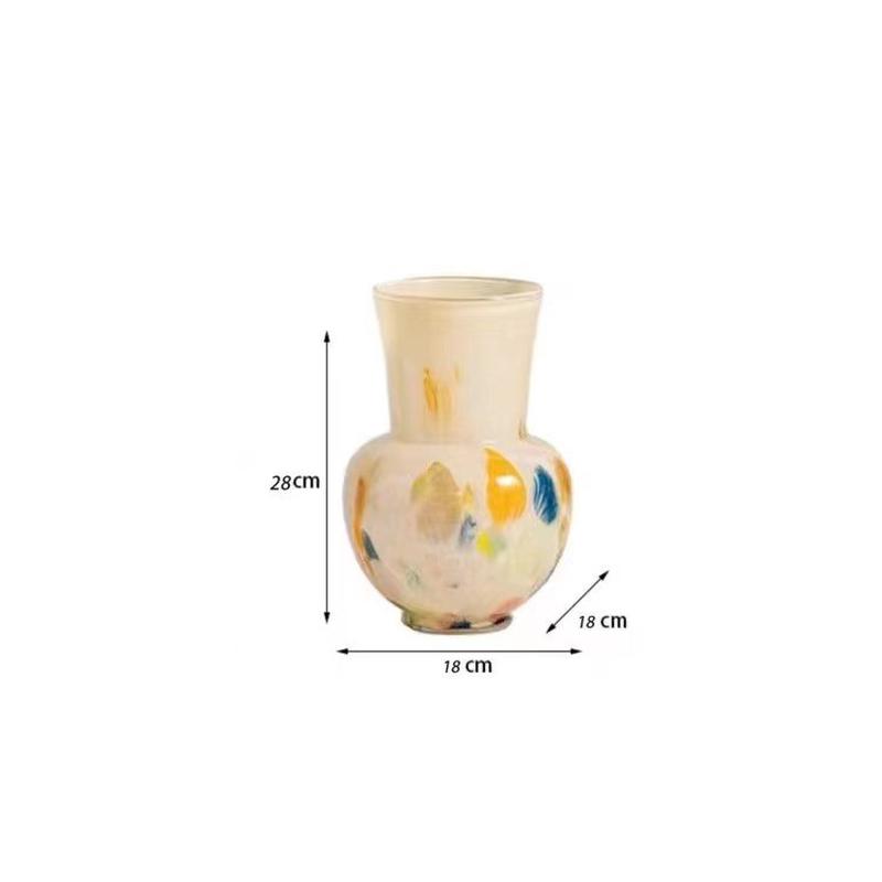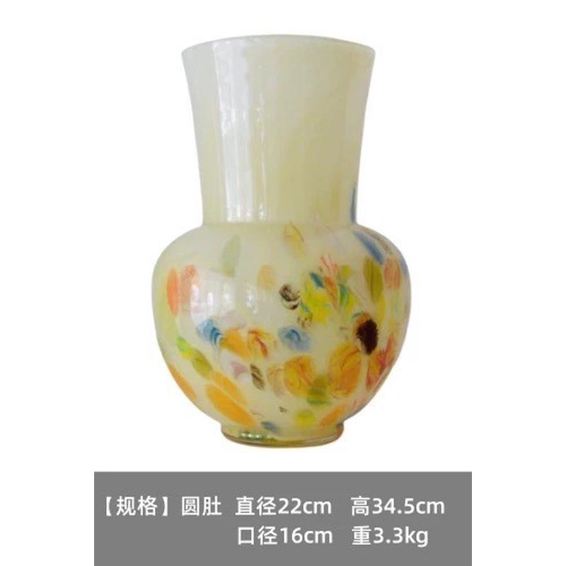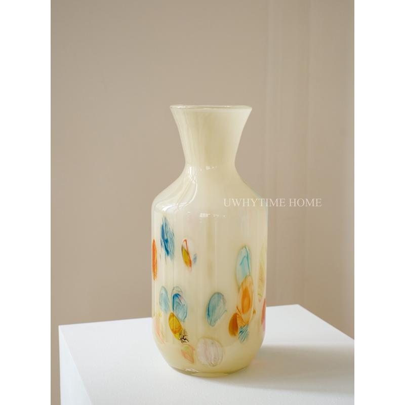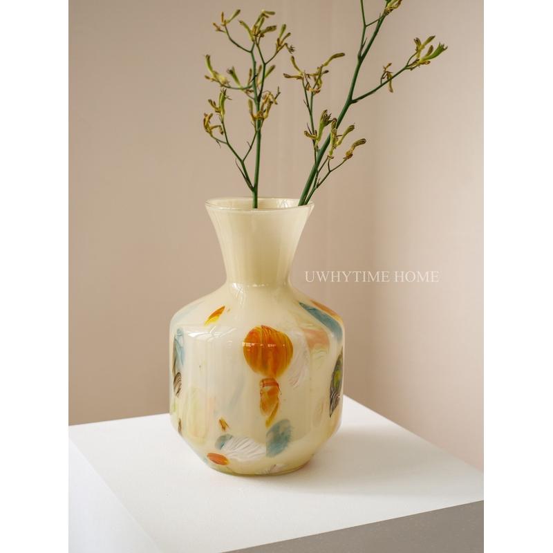 欣可北欧设计高级彩色琉璃奶黄色大口径手工中古风花瓶花器摆件