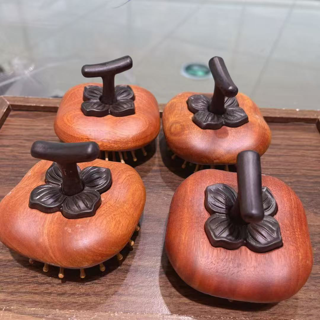 檀香木雕刻柿柿如意款气垫梳子便携小巧按摩化妆梳 可爱风送礼品