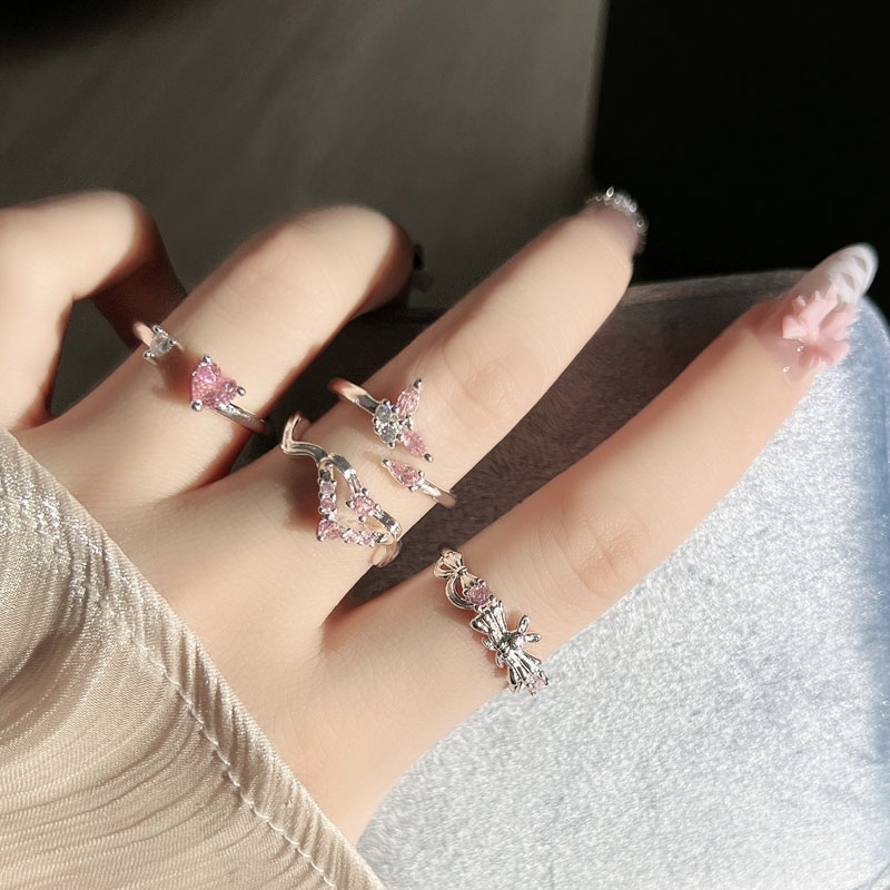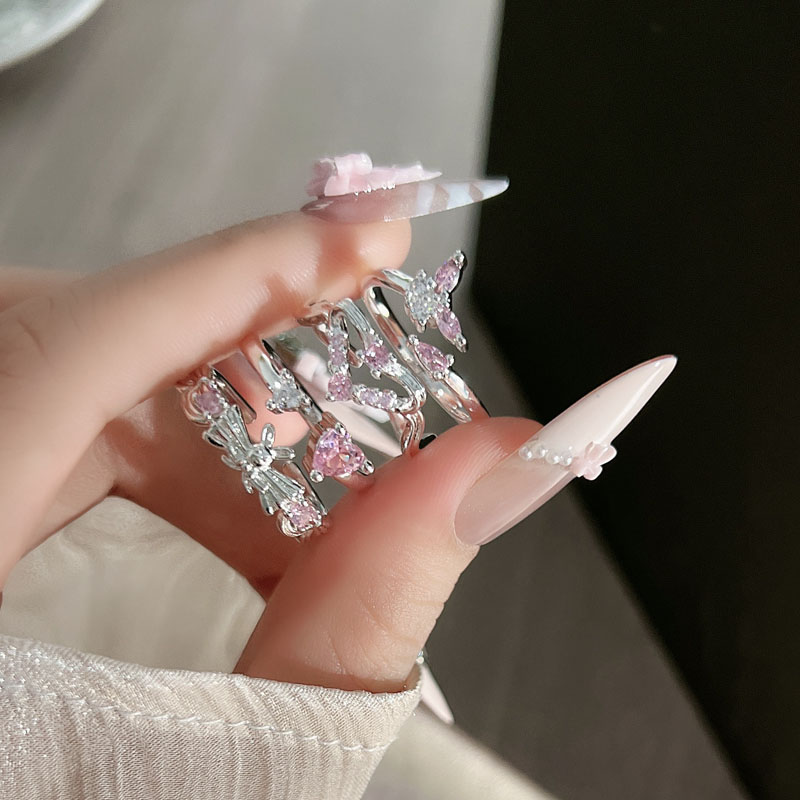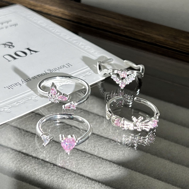 少女风甜酷粉钻爱心蝴蝶精致开口戒指女小众轻奢简约叠戴指环配饰