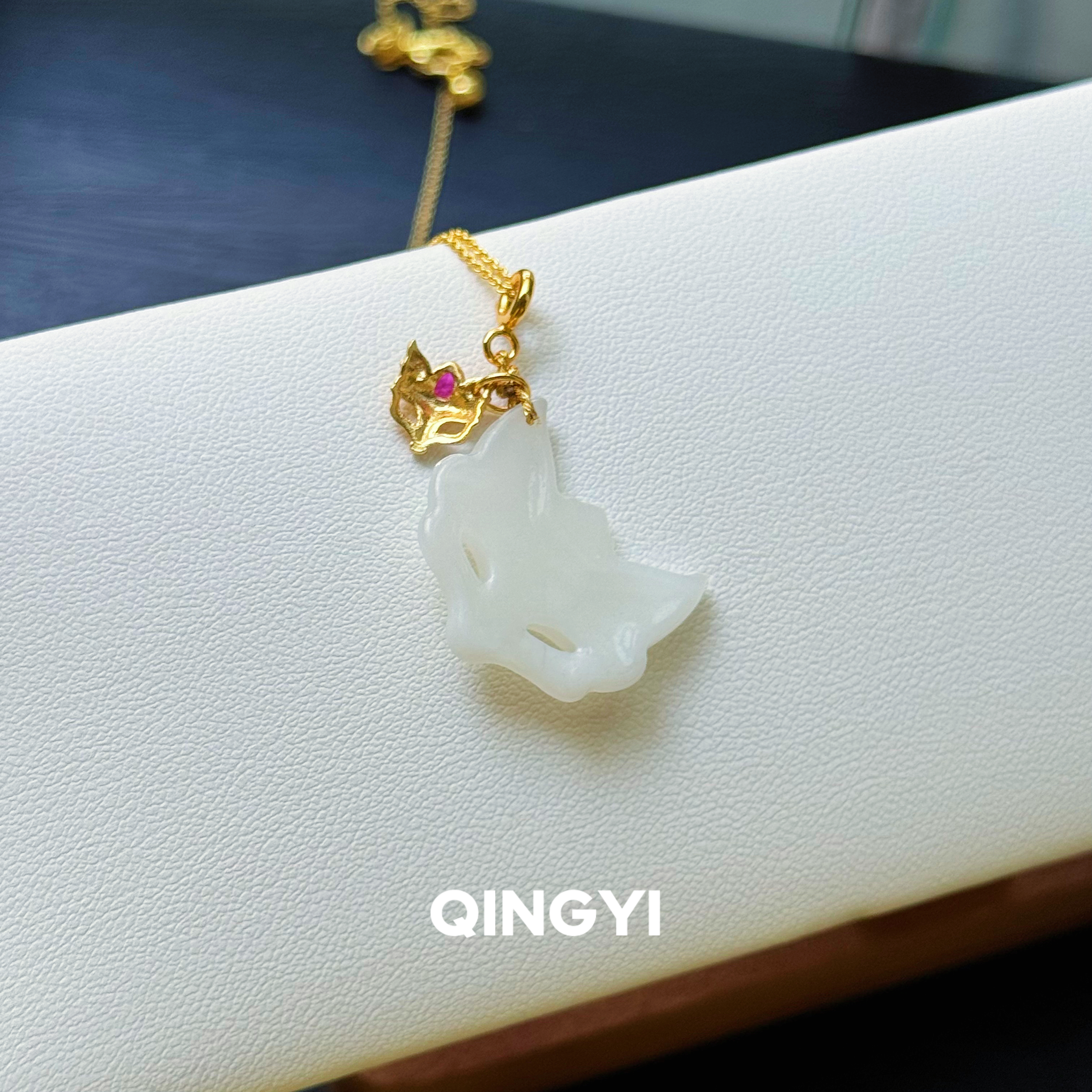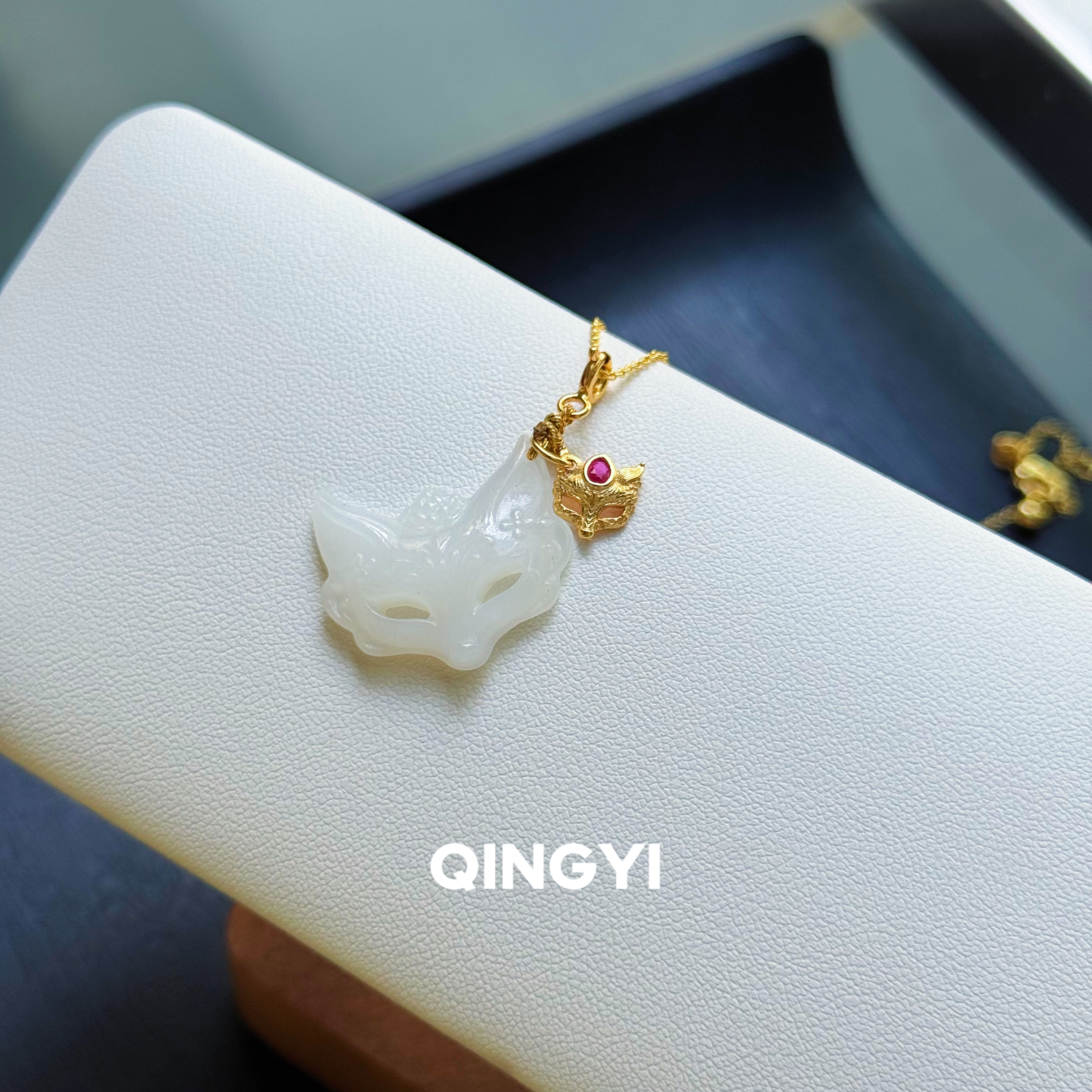 天然青料和田玉白玉狐狸面具吊坠s925银搭女款玉石挂件玉坠送女友