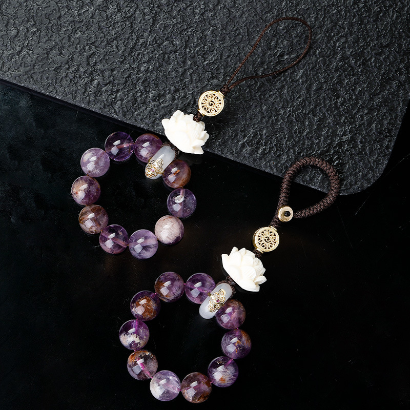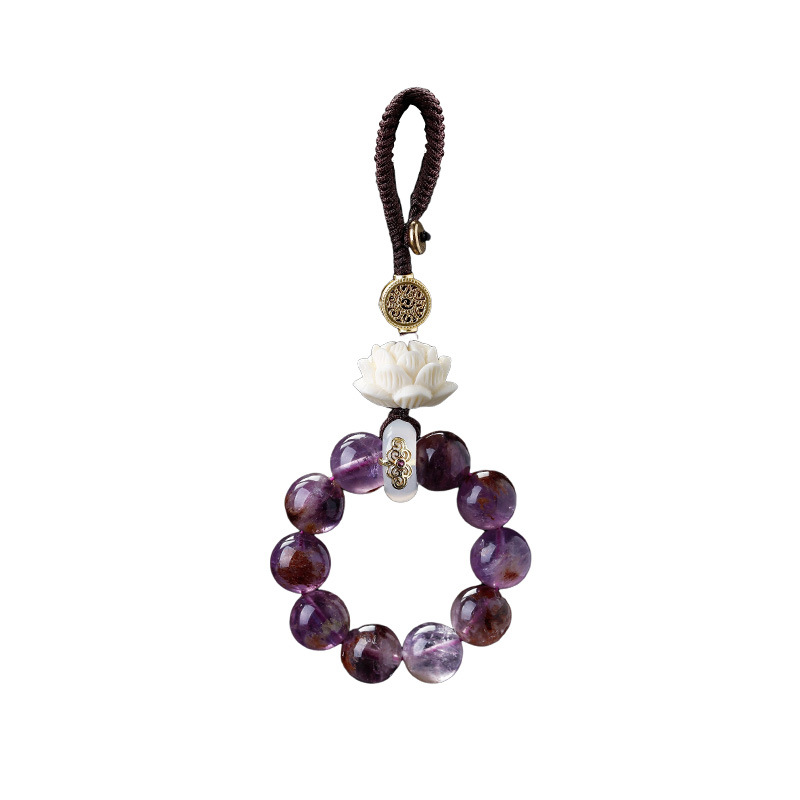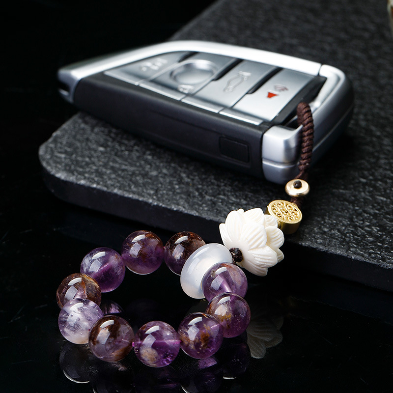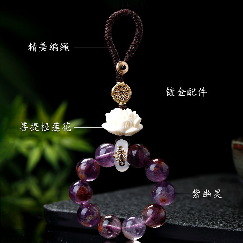 九子离火紫水晶汽车钥匙扣手机链挂件紫幽灵晶黄杨木莲花手机挂饰