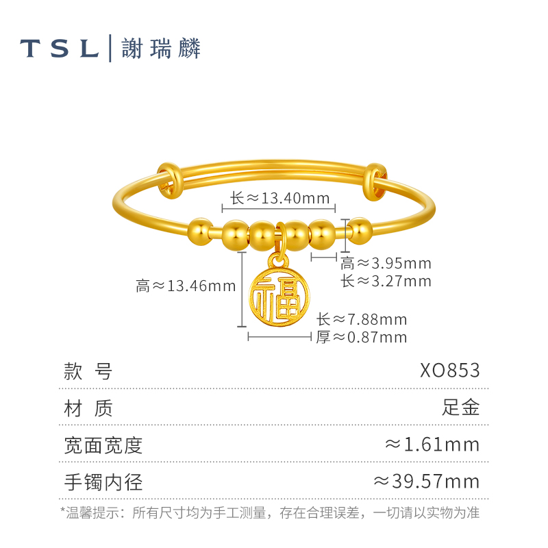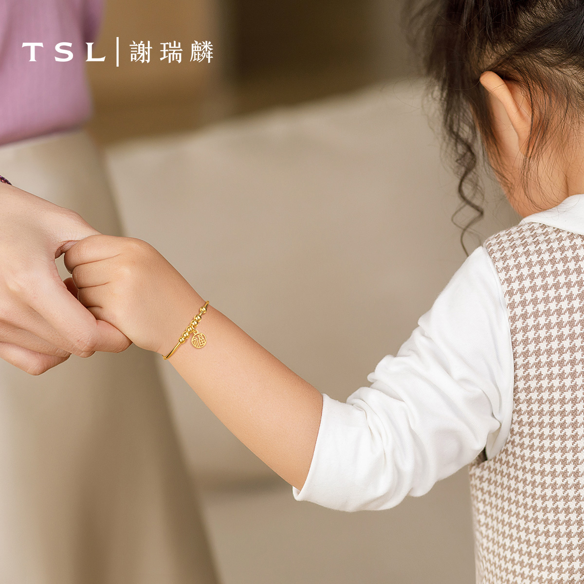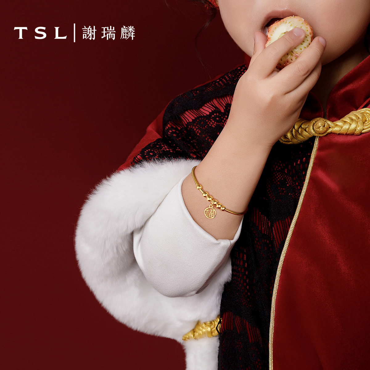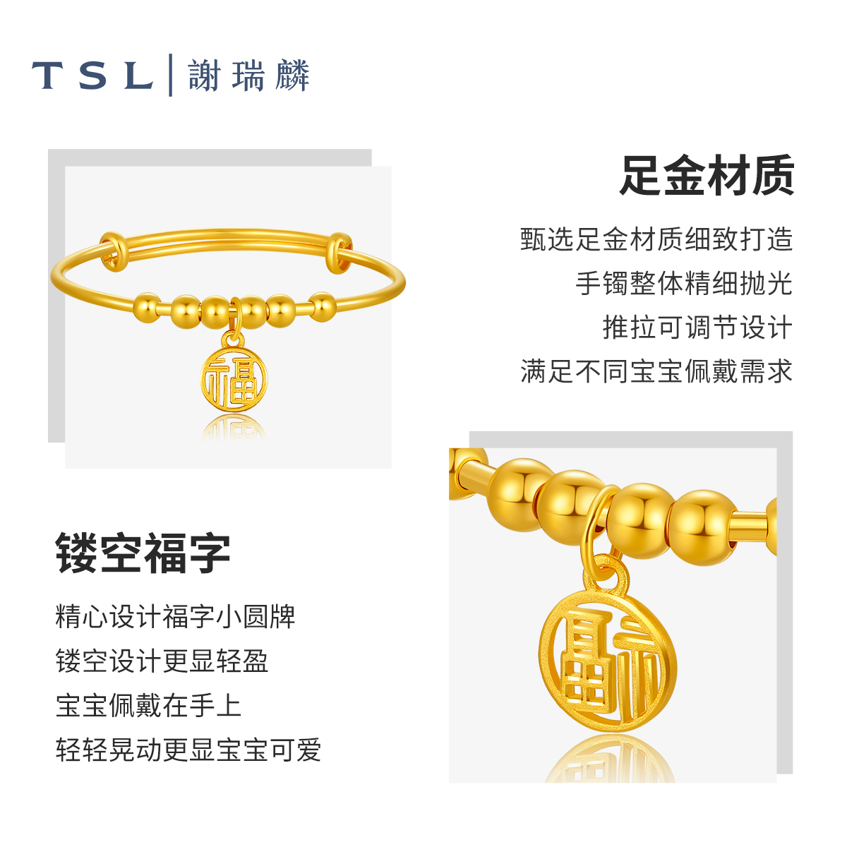 TSL谢瑞麟宝宝黄金手镯福字字牌金镯满月礼物金珠福牌手镯XO853
