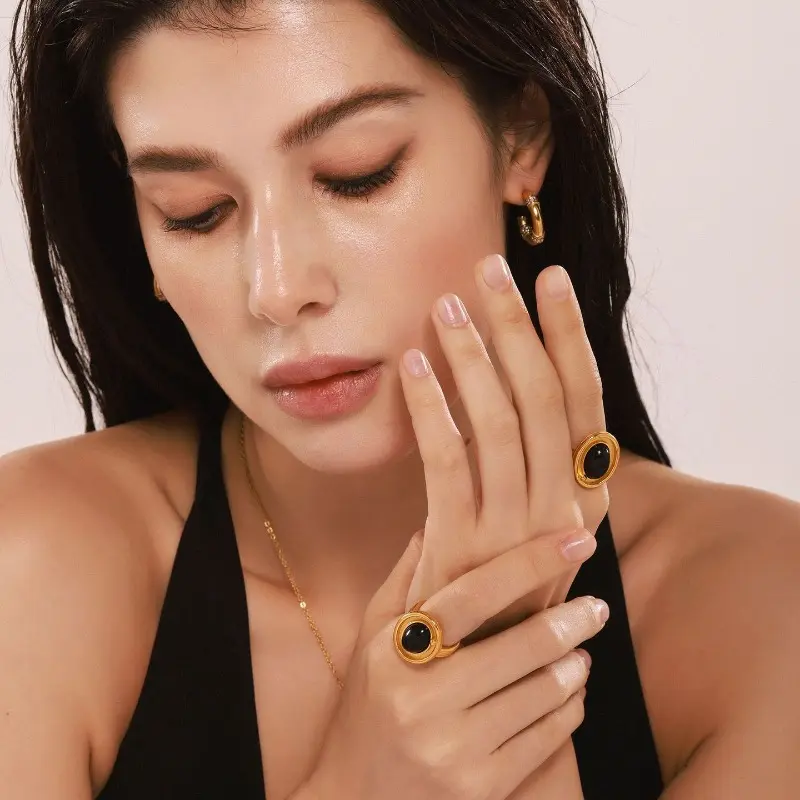 椭圆黑玛瑙戒指女钛钢镀18K金轻奢感指环高端个性黑色复古手饰品