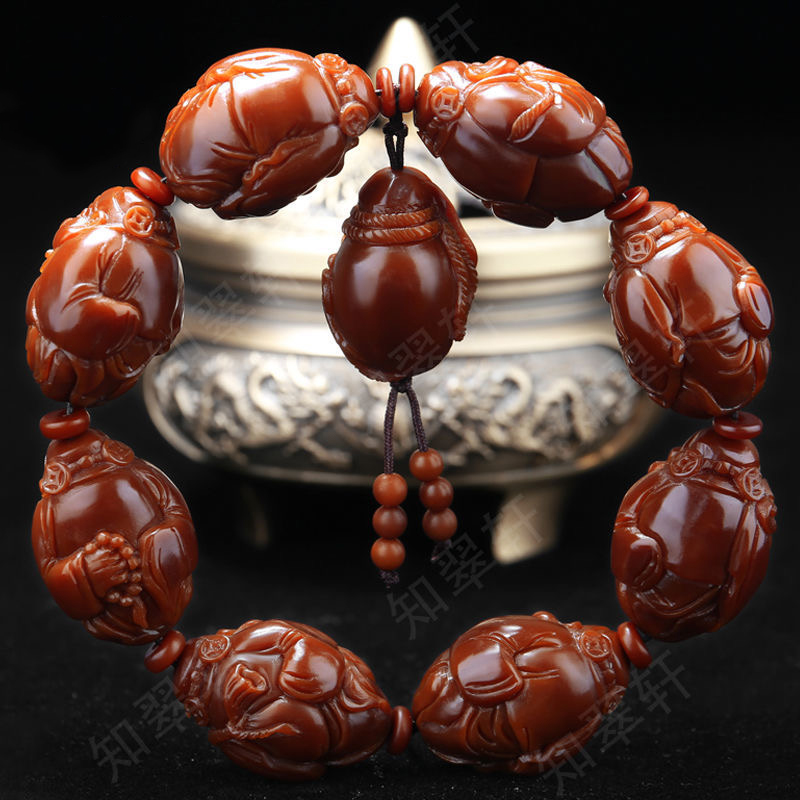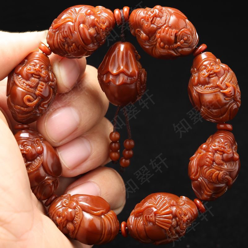 【机刷包浆】玉化橄榄核手串财神爷八方来财手工核雕文玩男女手链