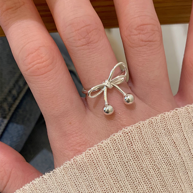 甜酷蝴蝶结戒指女简约几何线条绳结S925镀银开口指环小众食指戒潮