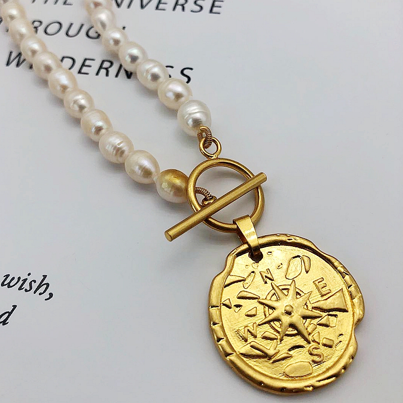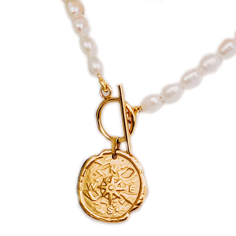 葡萄牙小众手作复古指南针天然珍珠项链孔雪儿同款罗盘T扣锁骨链