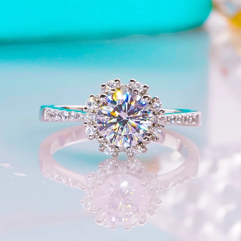 PT950铂金D色莫桑石群镶满钻四爪花朵戒指1克拉简约钻戒时尚纯银