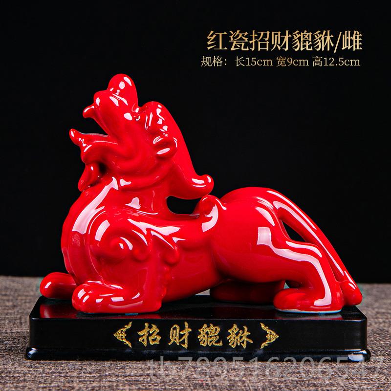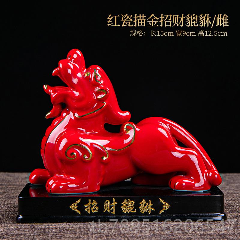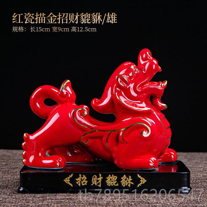 高档陶瓷招貅摆件 关红色财一对 玉石貔客厅玄办公室家居风水装饰
