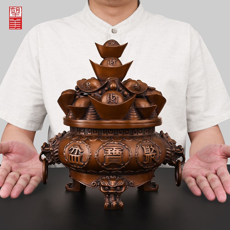 紫铜元宝金蟾聚宝盆摆件招聚铜制金山八方来财开业存钱聚宝盆带盖
