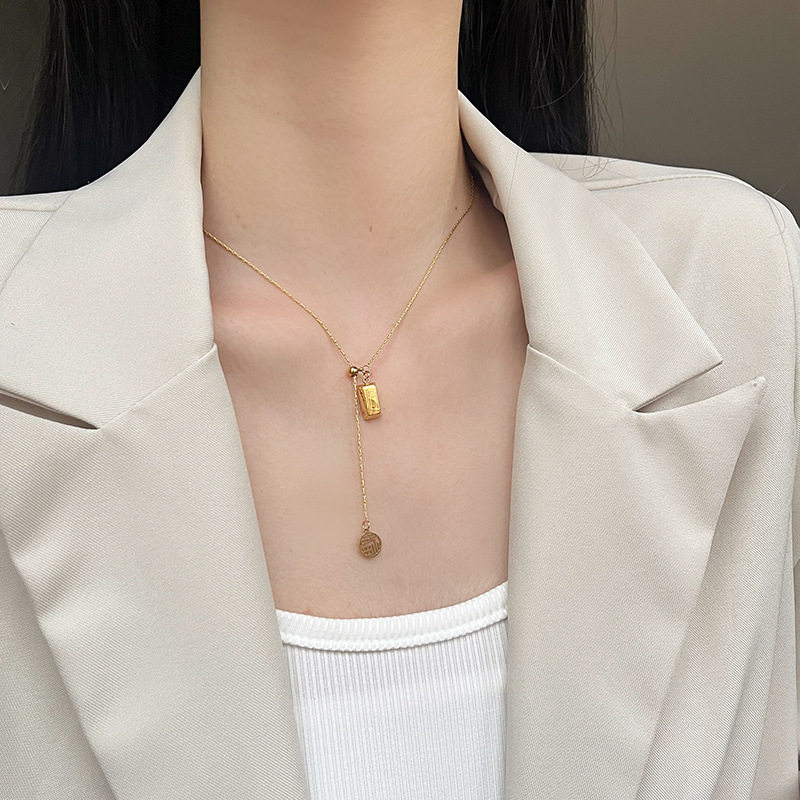 招财福牌小金砖项链女小众设计高级感钛钢不褪色抽拉可调节锁骨链