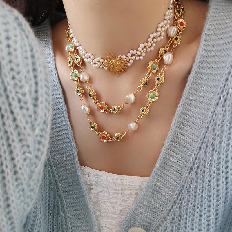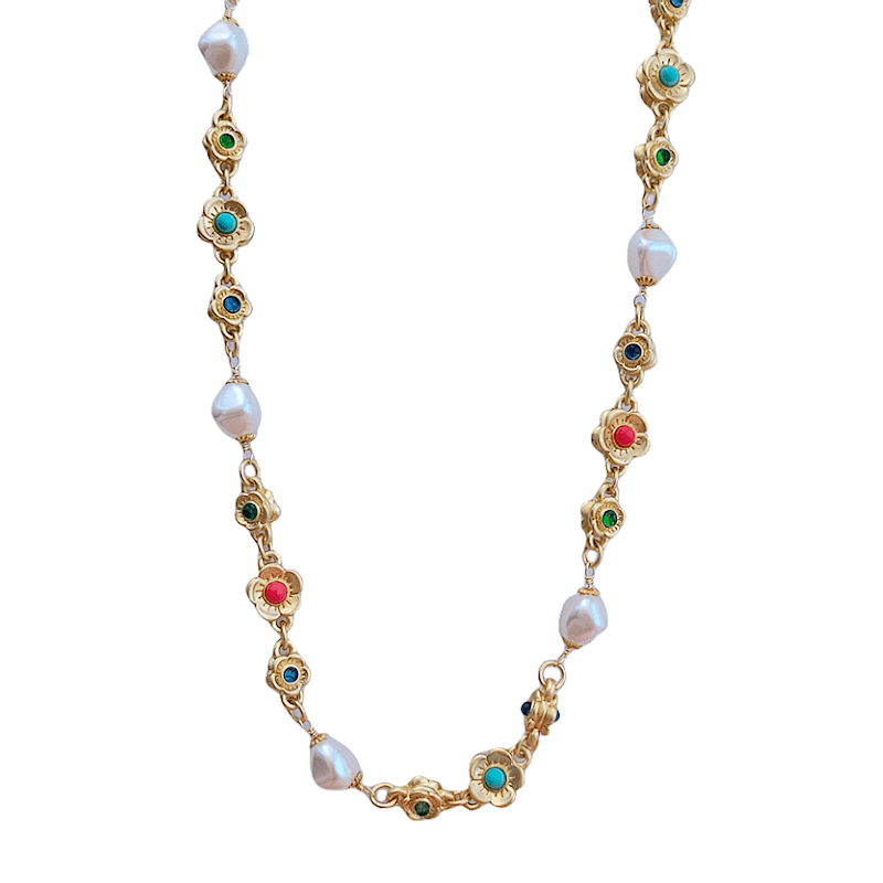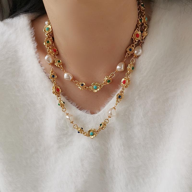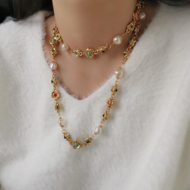 英国Luísa Lizz小众轻奢双面花朵珍珠毛衣链复古哑光彩色长项链