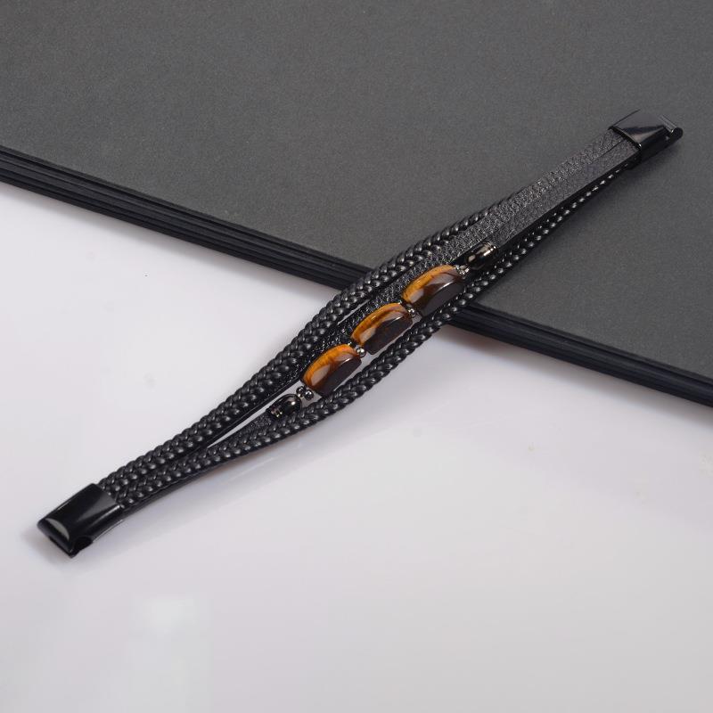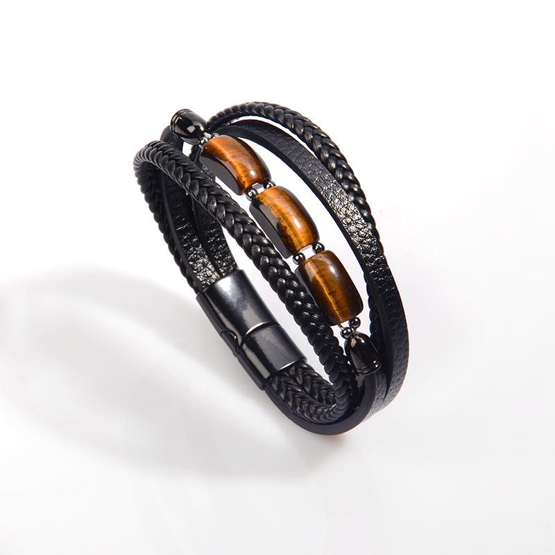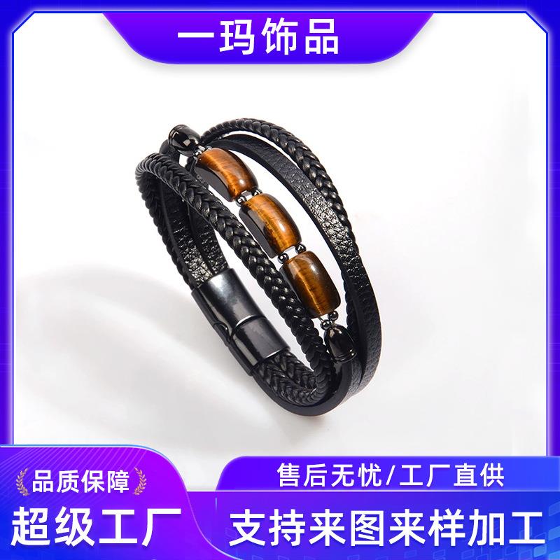 皮革手工编制多层手镯男士欧美风复古不锈钢扣手环虎眼石皮绳手链