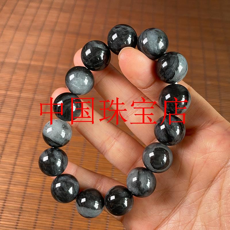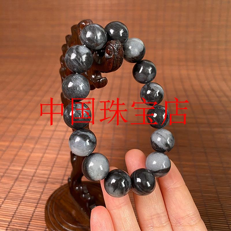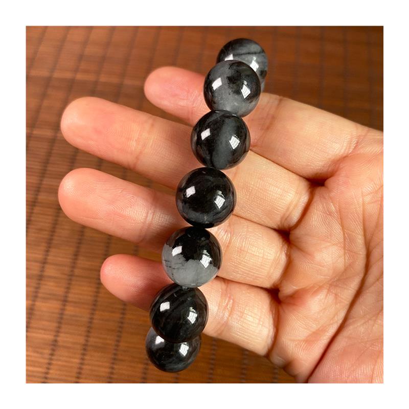 新疆和田玉青花籽料手串男女款玉石单圈佛珠圆珠子墨黑色飘花手链