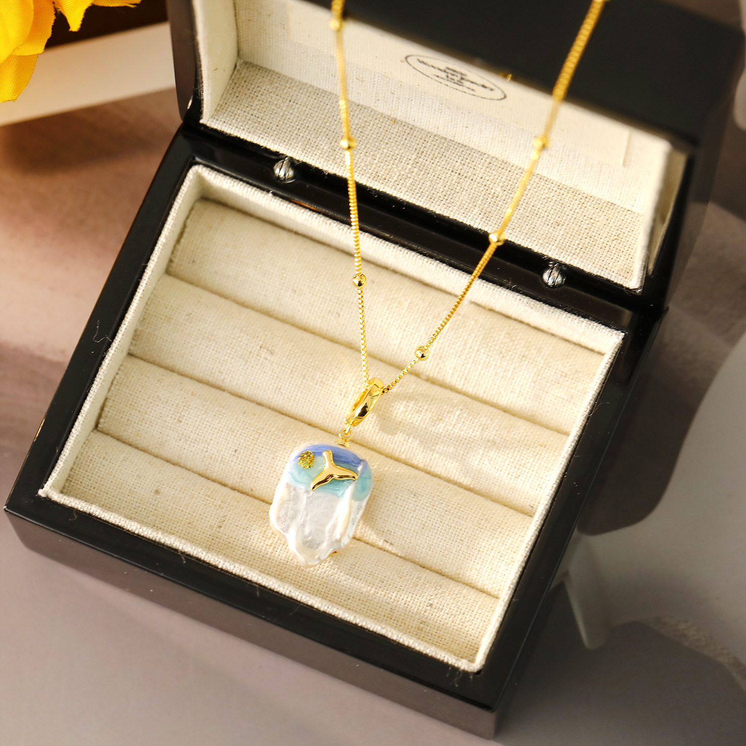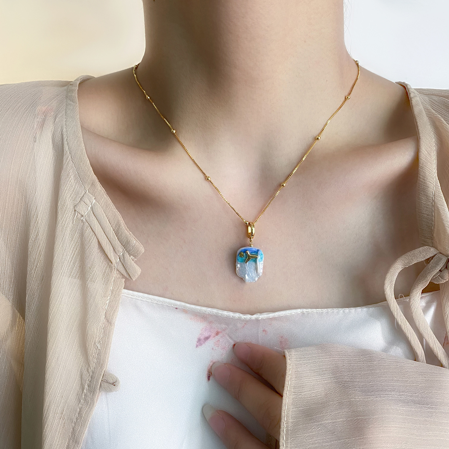 梦幻蓝色珠光滴油珍珠项链时尚高级感金隔珠圣诞款颈链毛衣链配饰