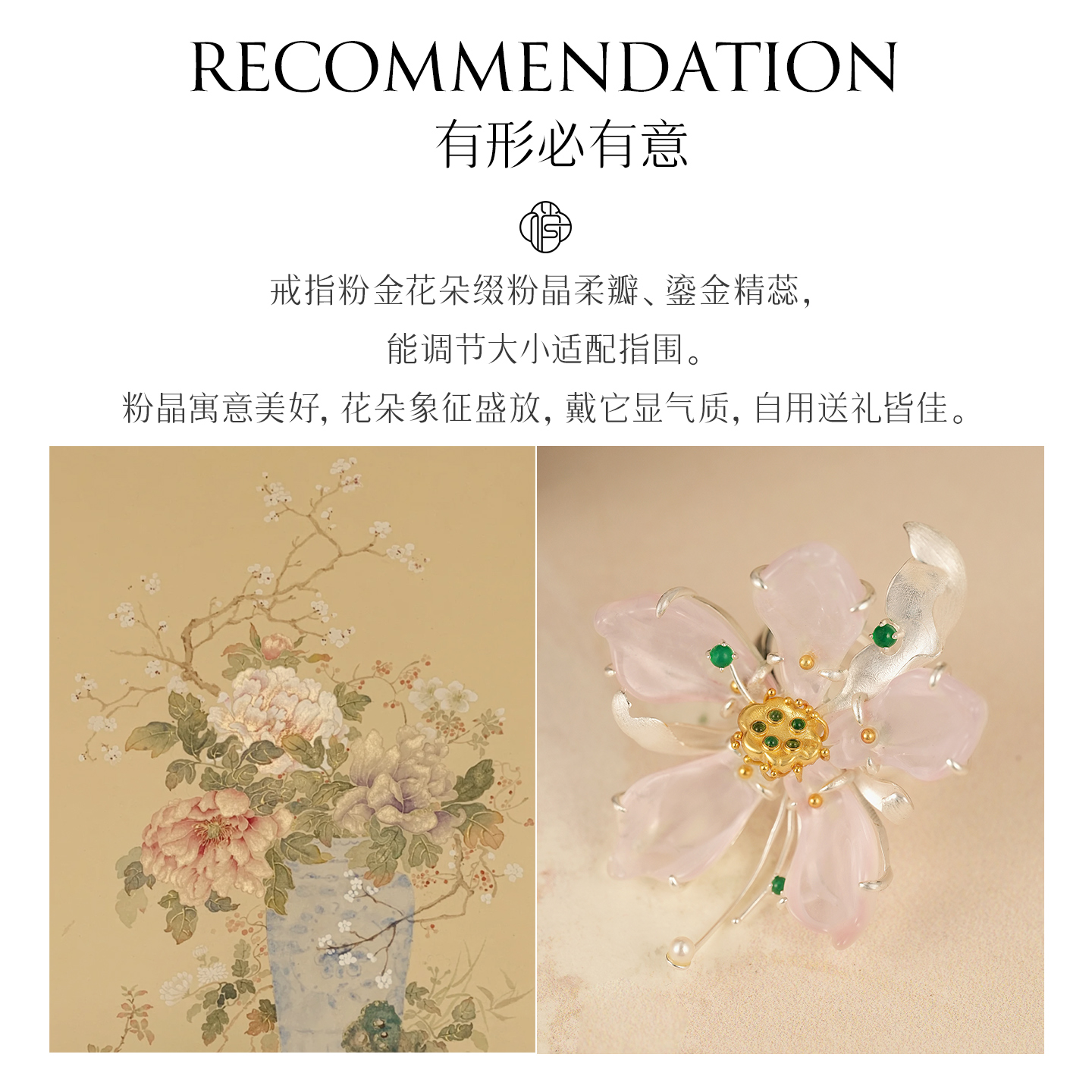 莲花两世欢粉水晶纯银戒指非遗錾刻拉丝新中式国风荷花开口银指环