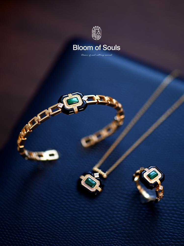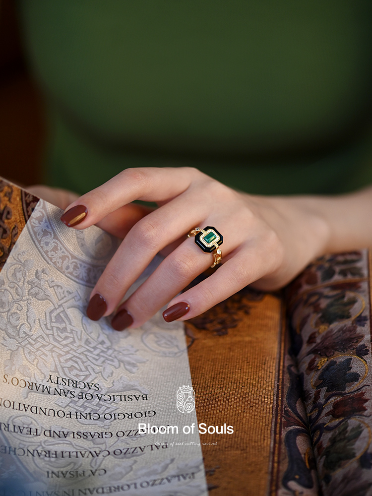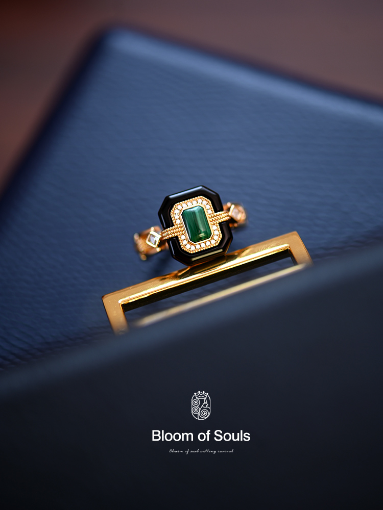 《绿洲彼岸》原创设计S925纯银戒指天然孔雀石黑玛瑙女法式复古新