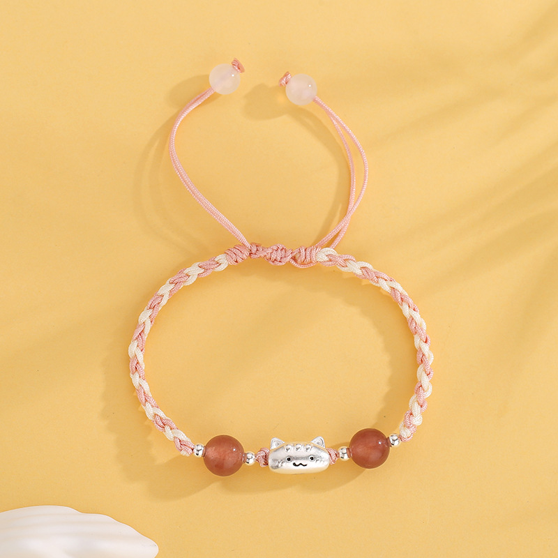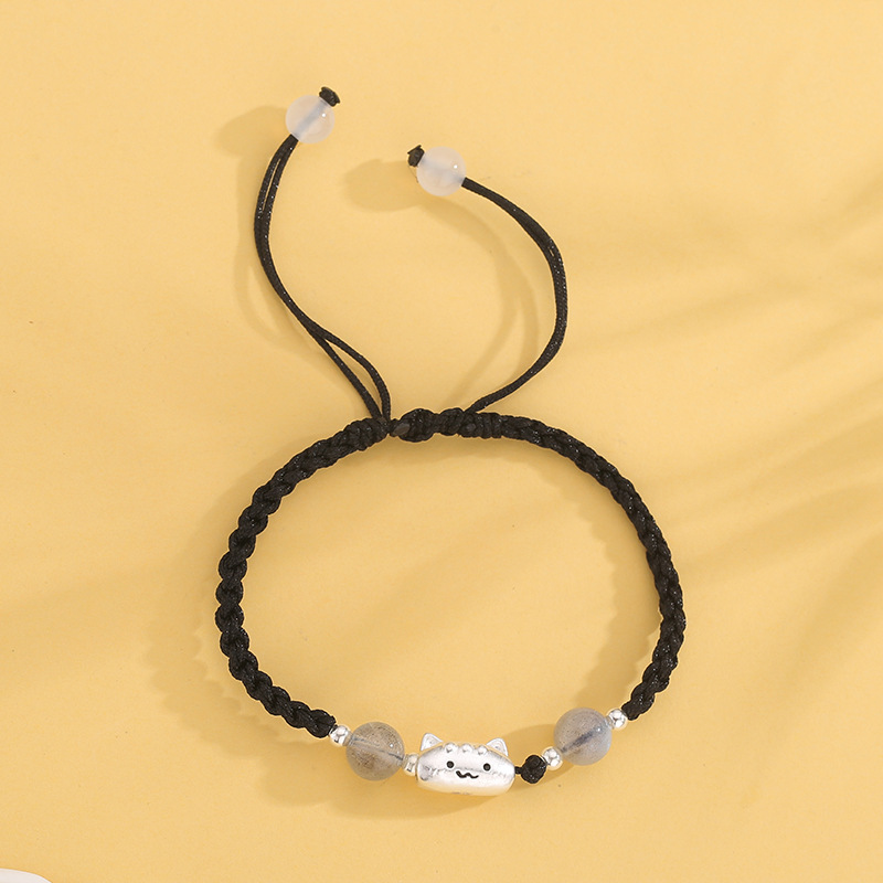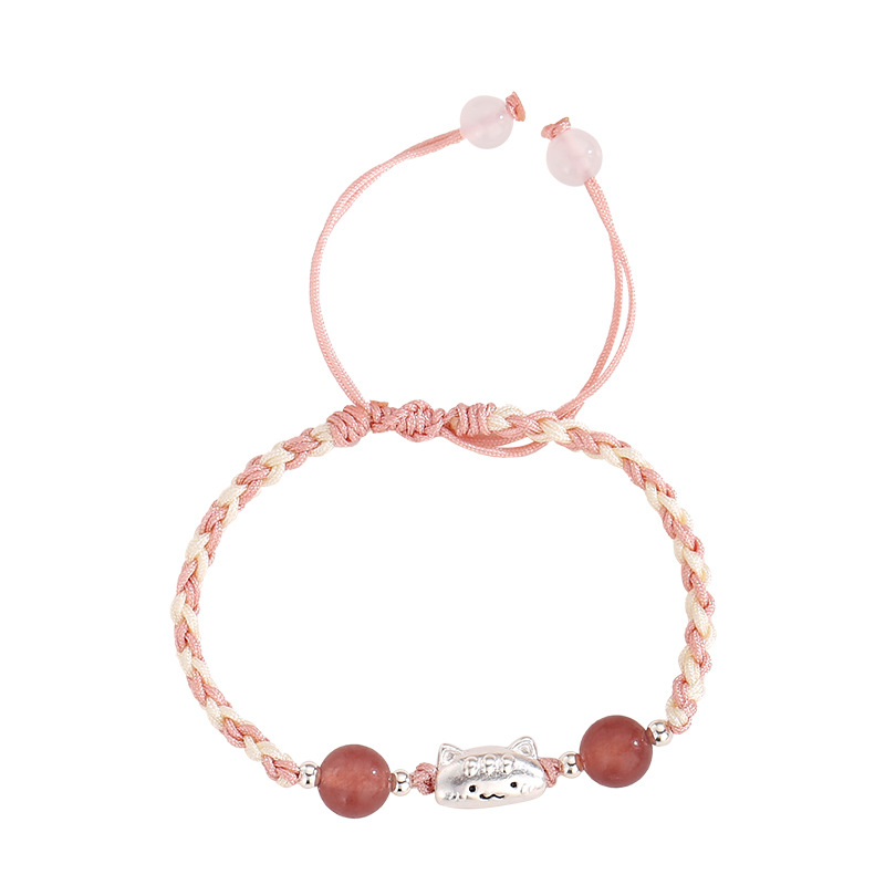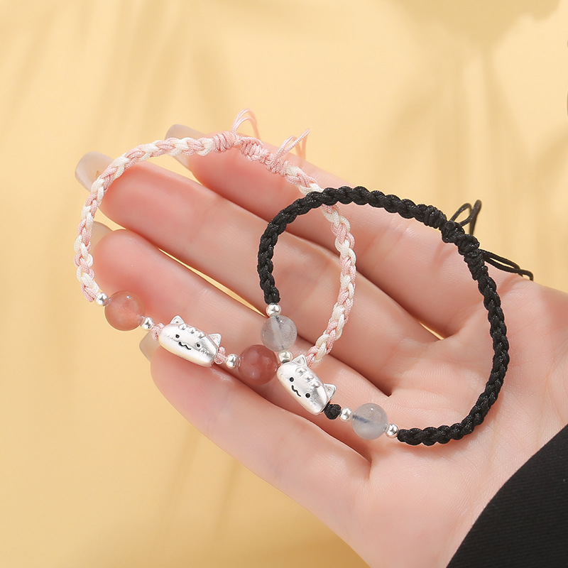 卡通法棍猫手绳手工编织绳情侣学生送生日礼物手链粉色黑绳ins风