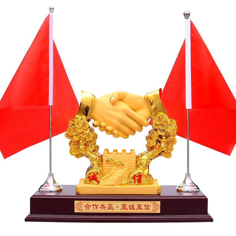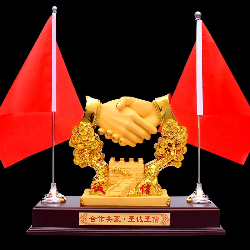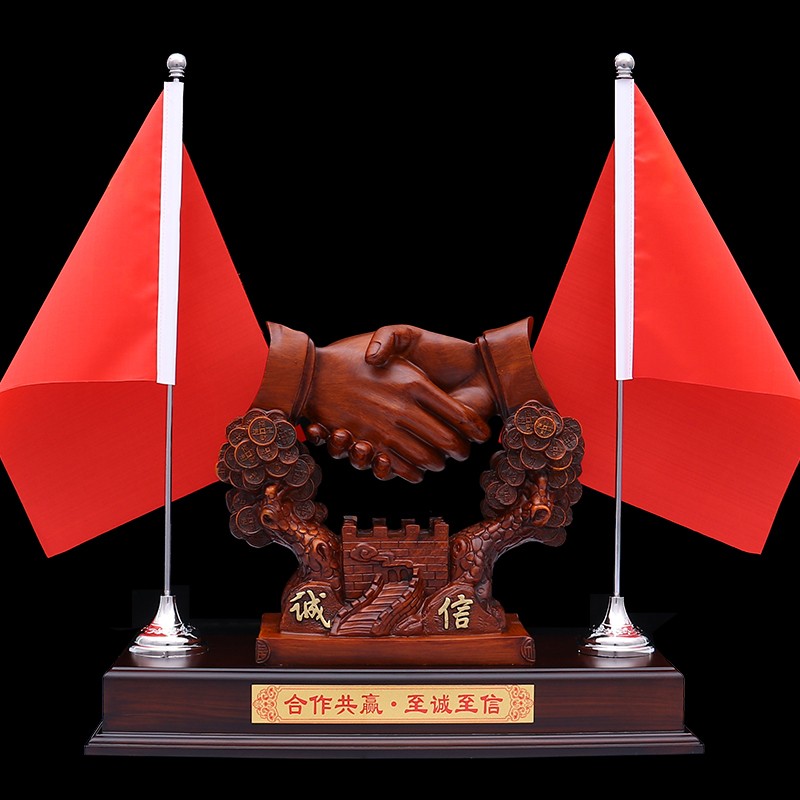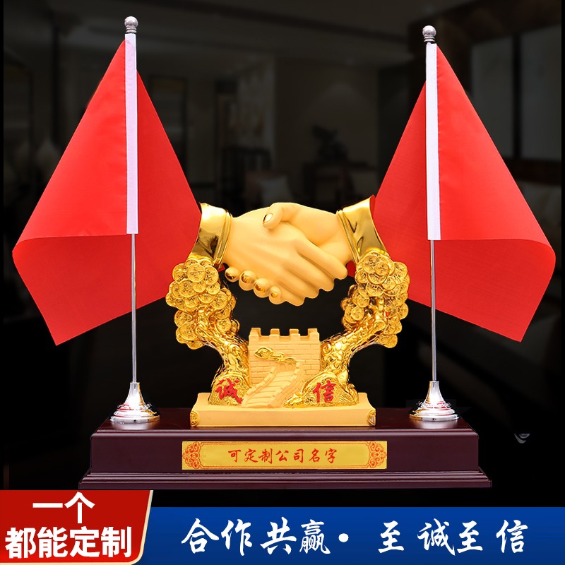 合作共赢握手摆件老板领导办公室桌面G创意装饰品红旗高档定制礼