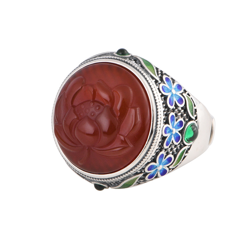S925纯银景泰蓝珐琅彩戒指和田玉红玛瑙女款民族风中式花丝银指环