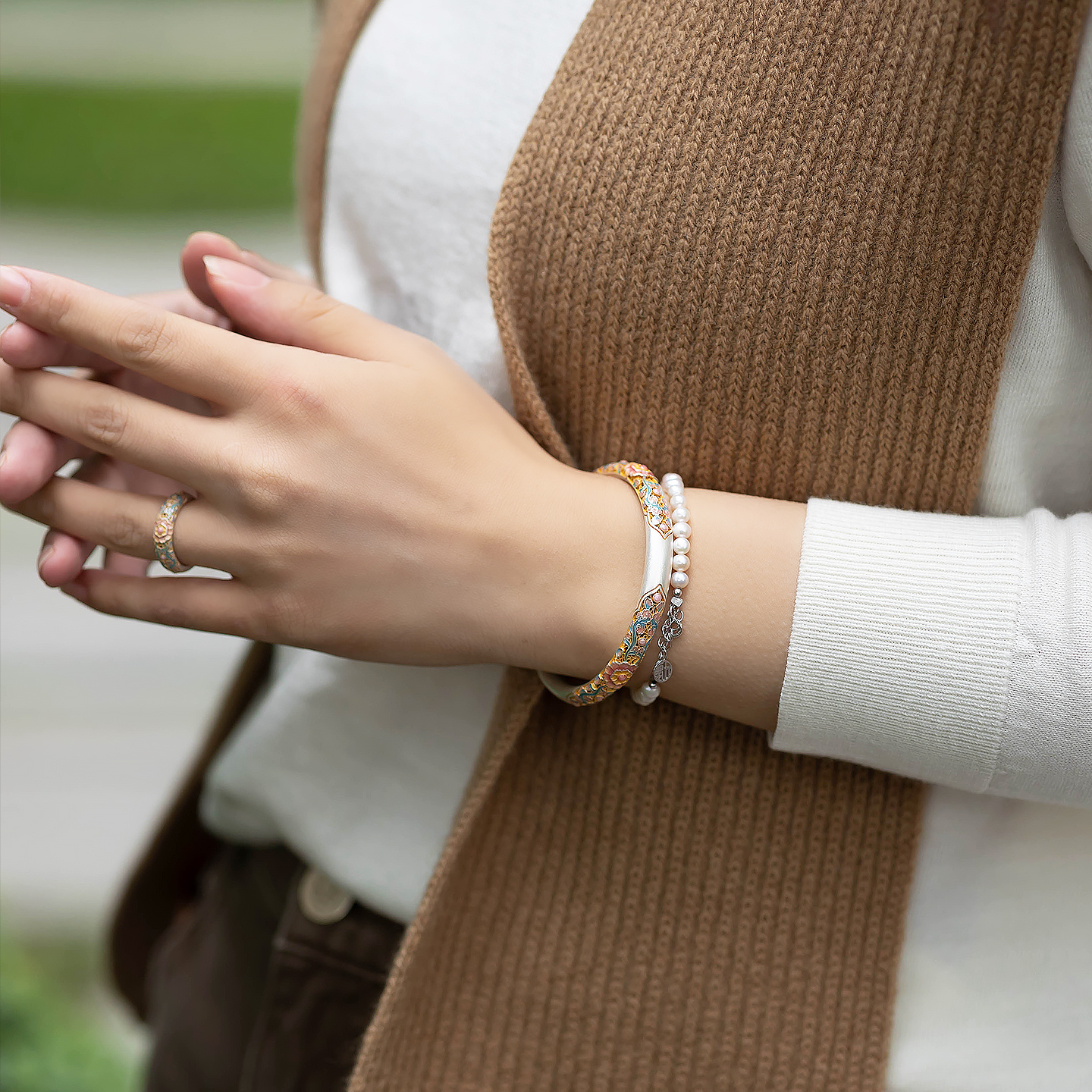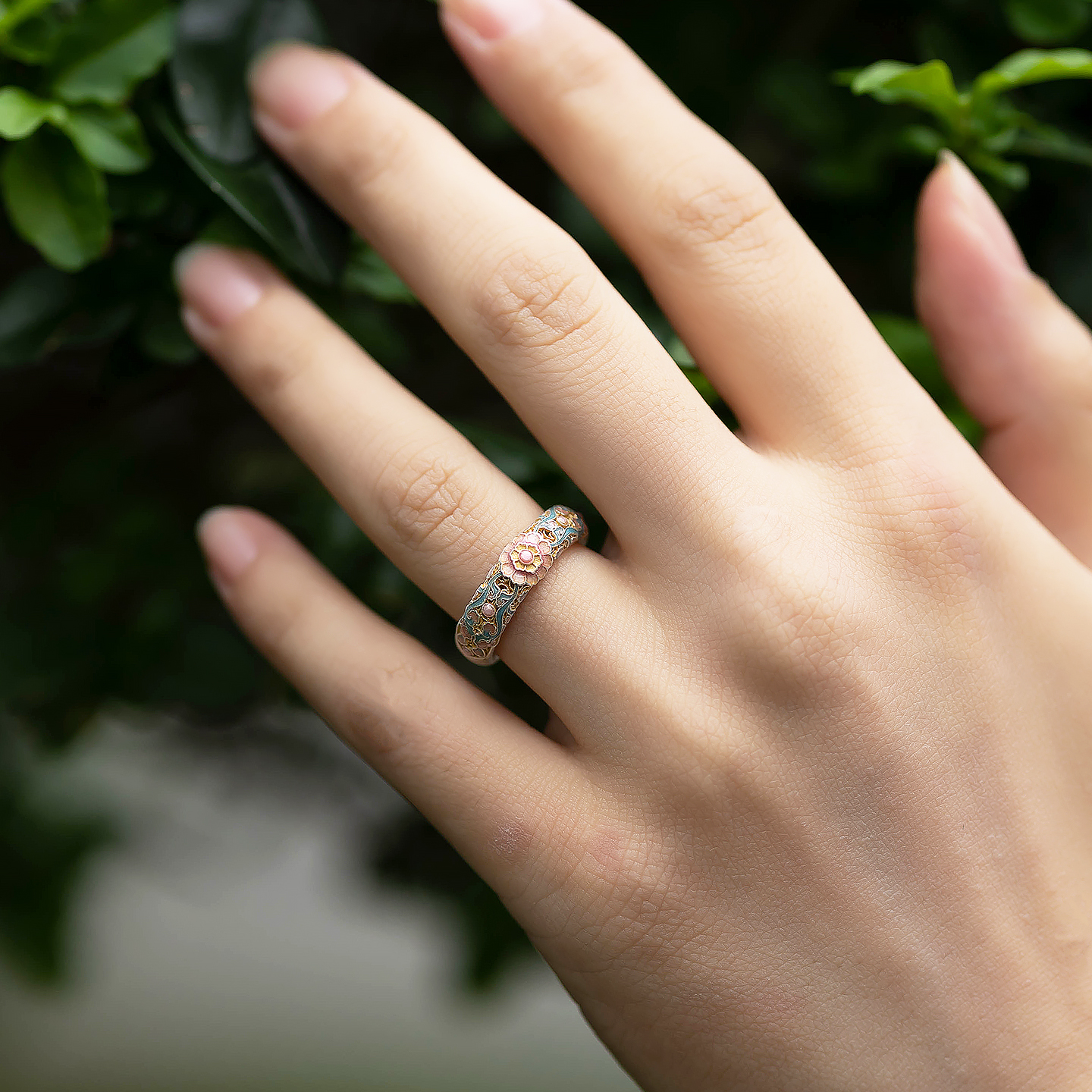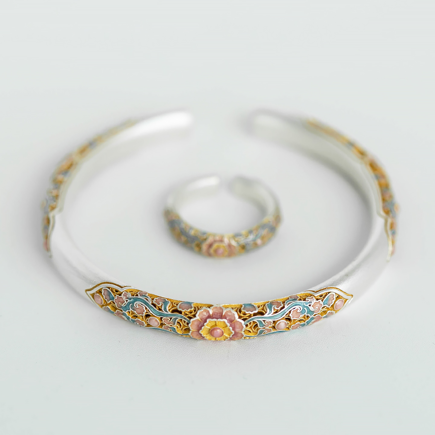 蜀锦 海棠花纯银足银9999描金珐琅彩镂空开口手镯手环新中式国风