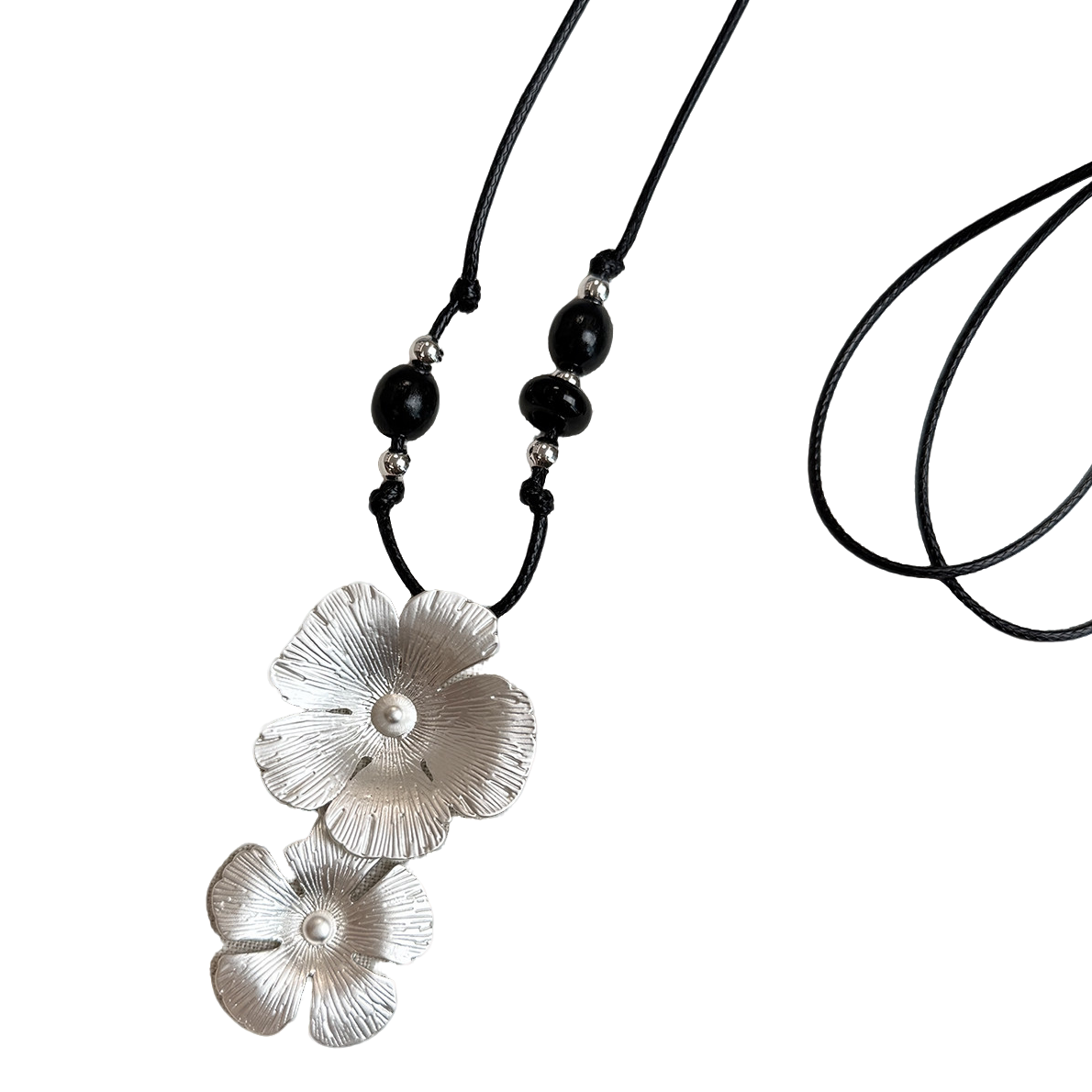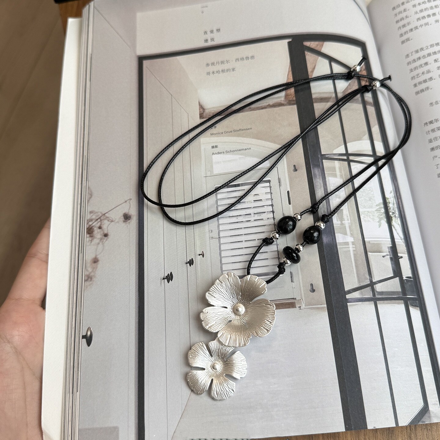 银色繁花拉丝复古黑色编绳长项链小众设计高级感毛衣链2026新爆款