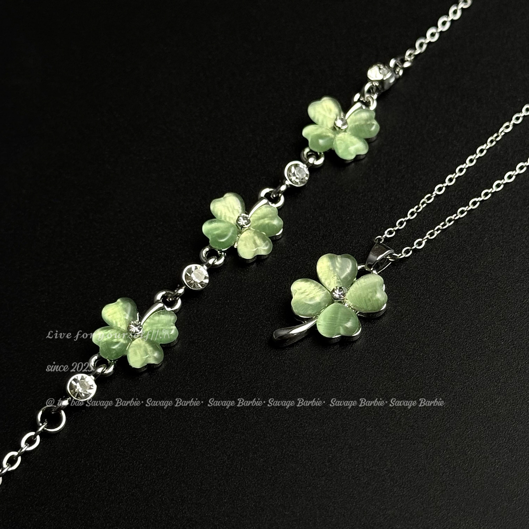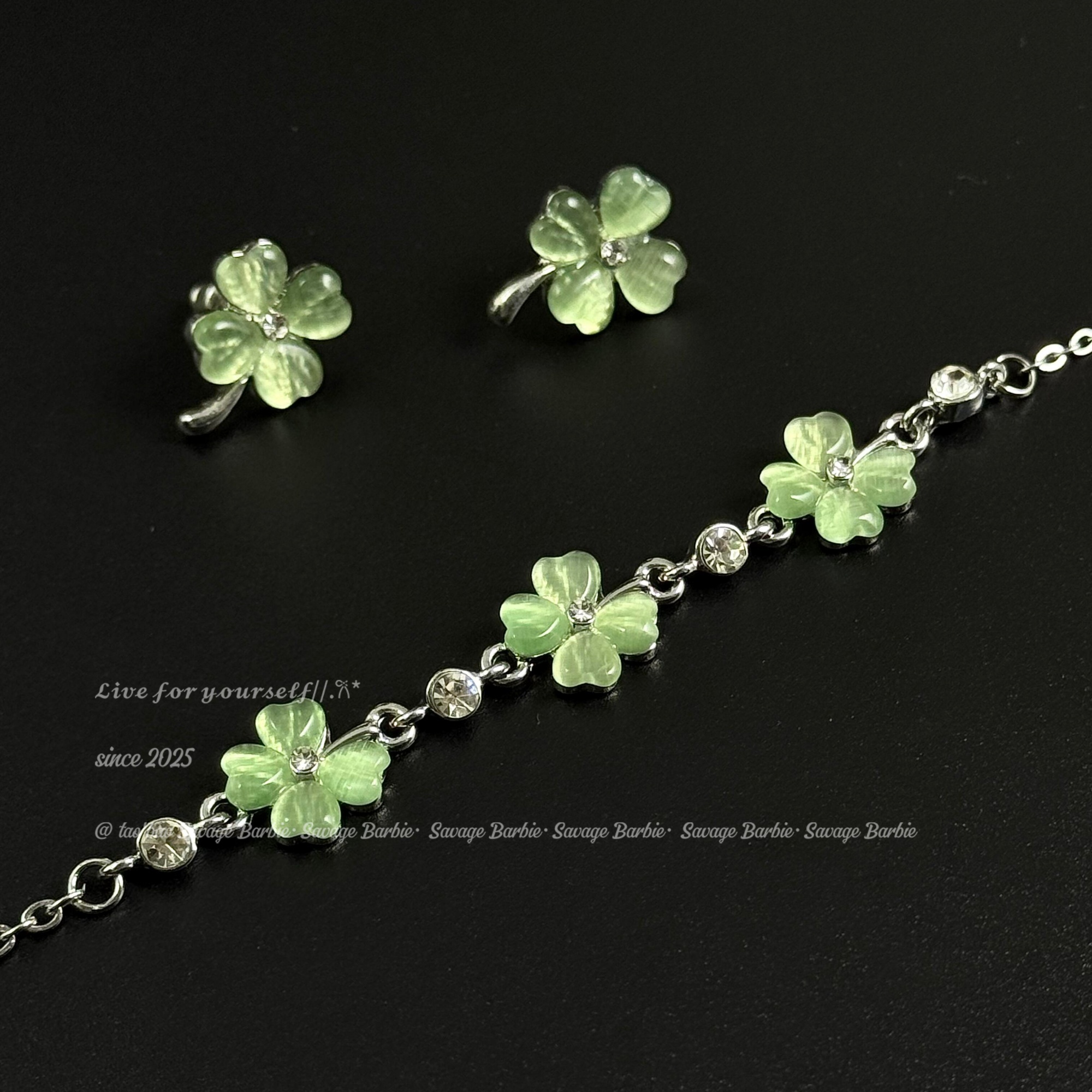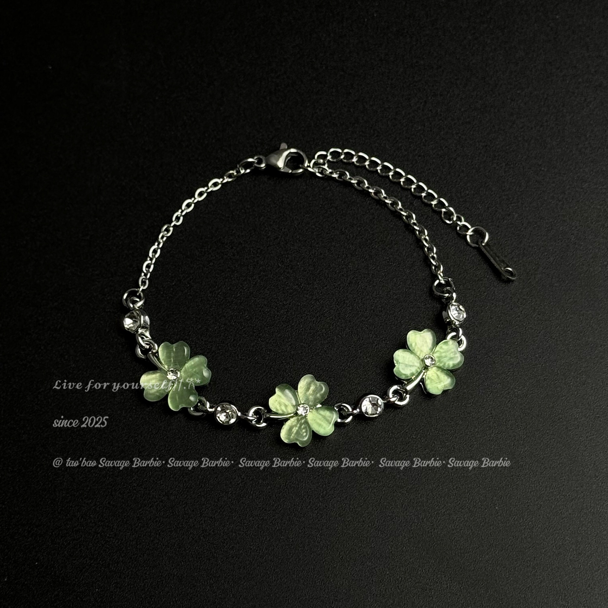 Vintage古着绿色幸运四叶草手链森系小清新气质手环高级感项链女