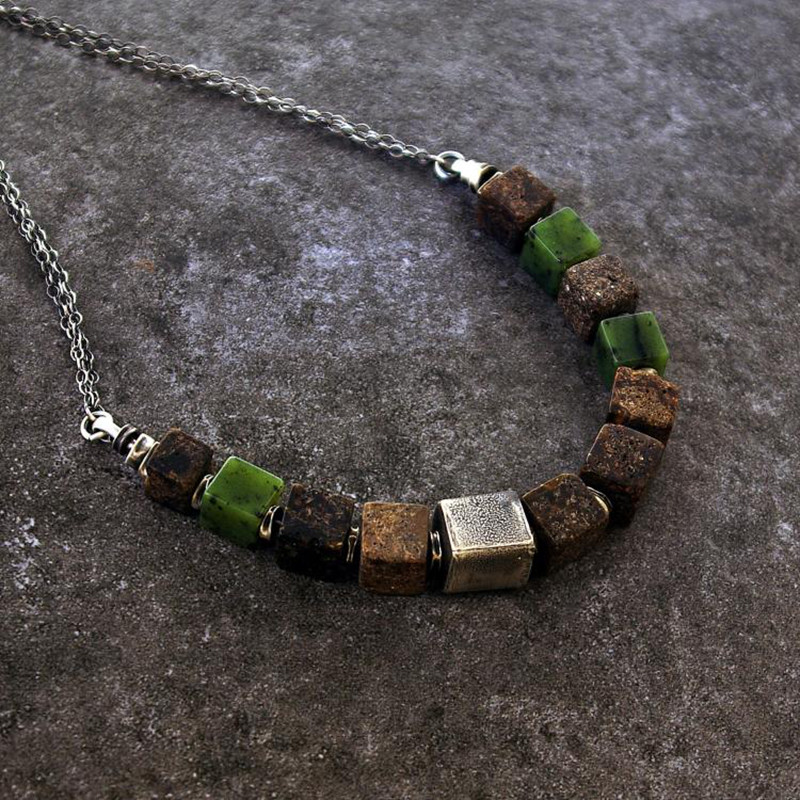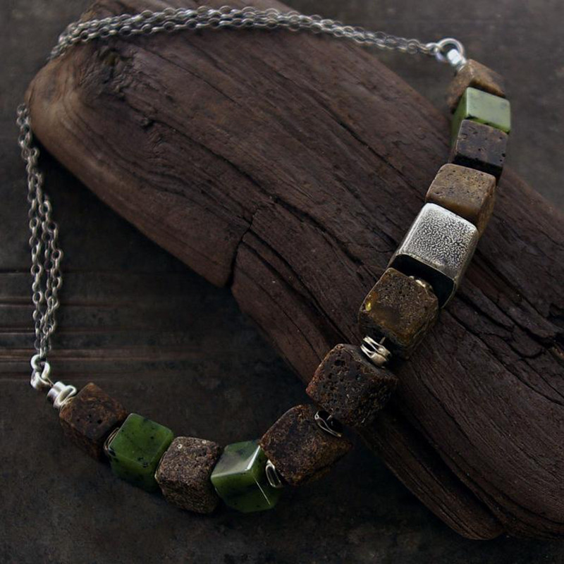 波兰代购Amber◇手作复古天然立方体原始琥珀绿色软玉纯银项链