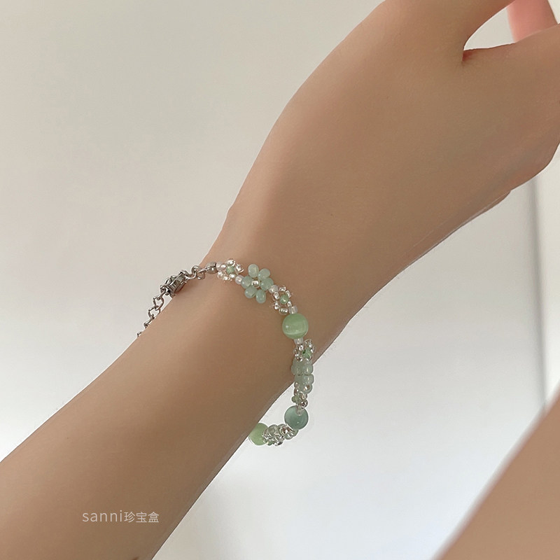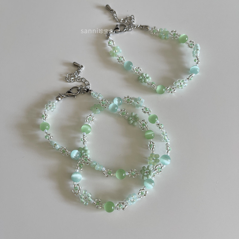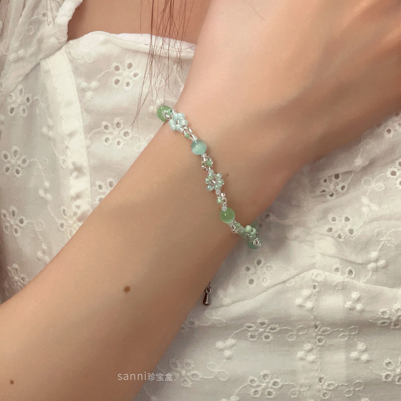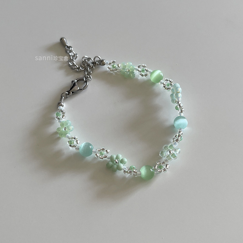 sanni珍宝盒 薄荷绿日本米珠手工串珠绿色系花朵手链不锈钢