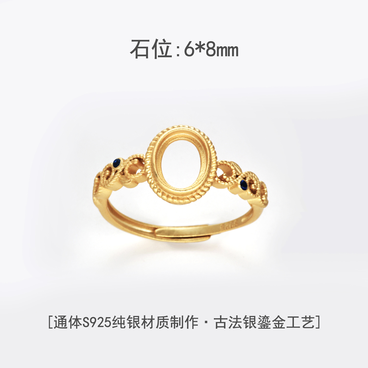 S925纯银戒指空托古法银鎏金工艺diy手工镶嵌翡翠玉石戒面戒托6*8