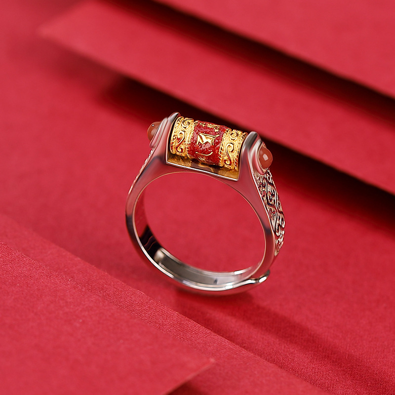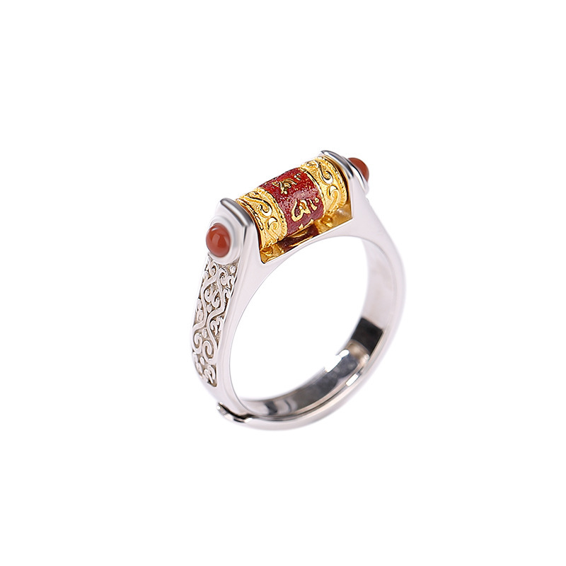 新品南红浮雕立体祥云六字真言心经转动戒指开口指环