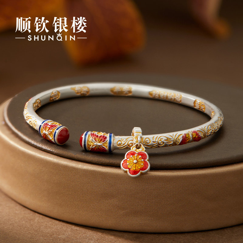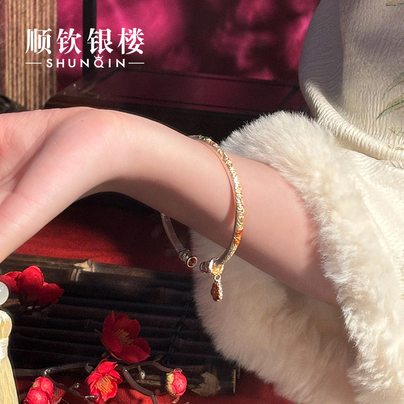 顺钦银楼S9999纯银手镯女新中式锦上添花足银国风吉言轻奢银手镯