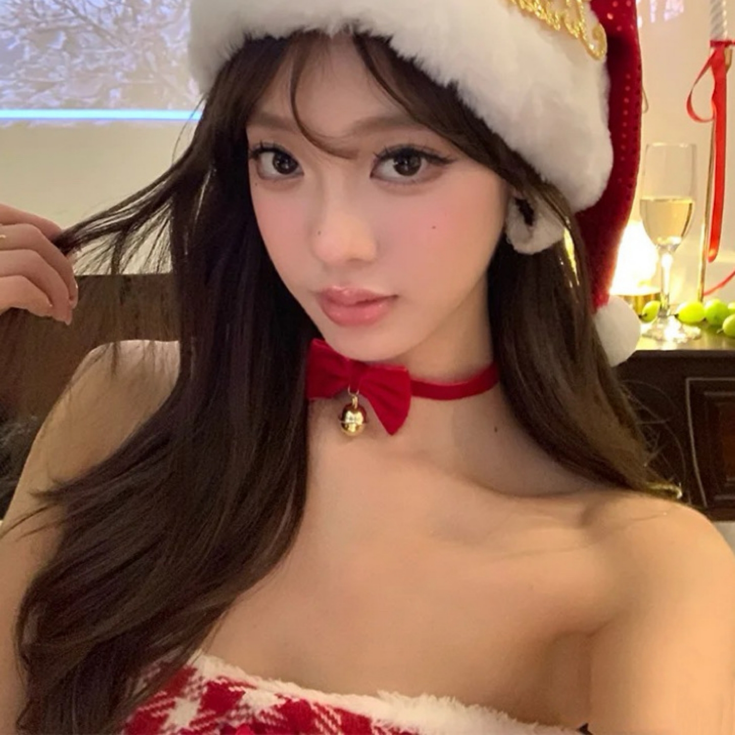 可爱毛绒项链甜美红色蝴蝶结铃铛choker项圈锁骨链新年圣诞节配饰