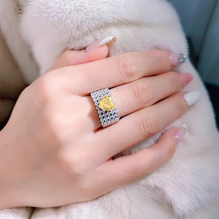 纯18K白金镶嵌美国进口D色莫桑石满钻爱心黄钻戒指时尚高级精致款