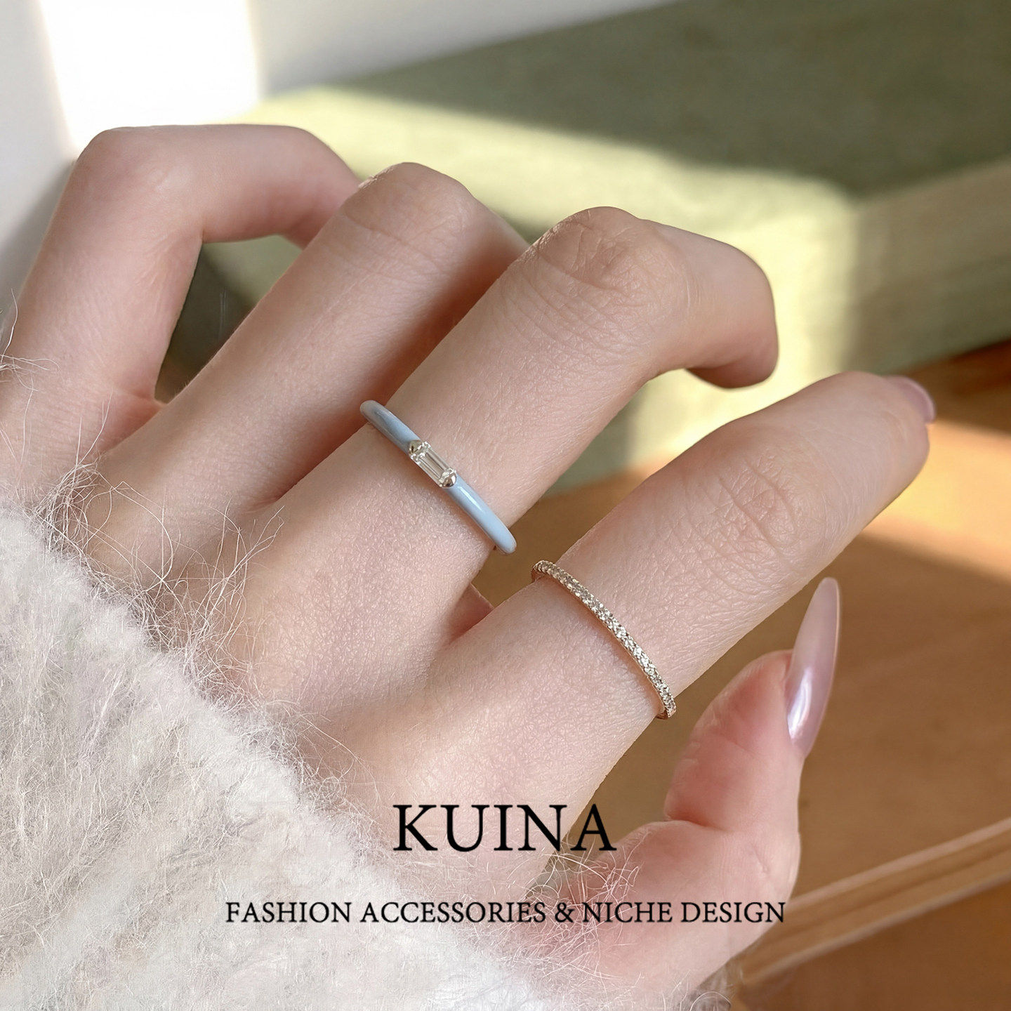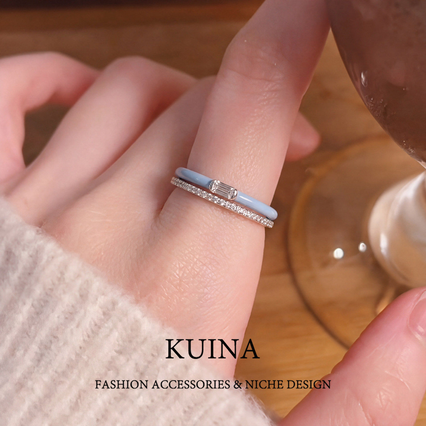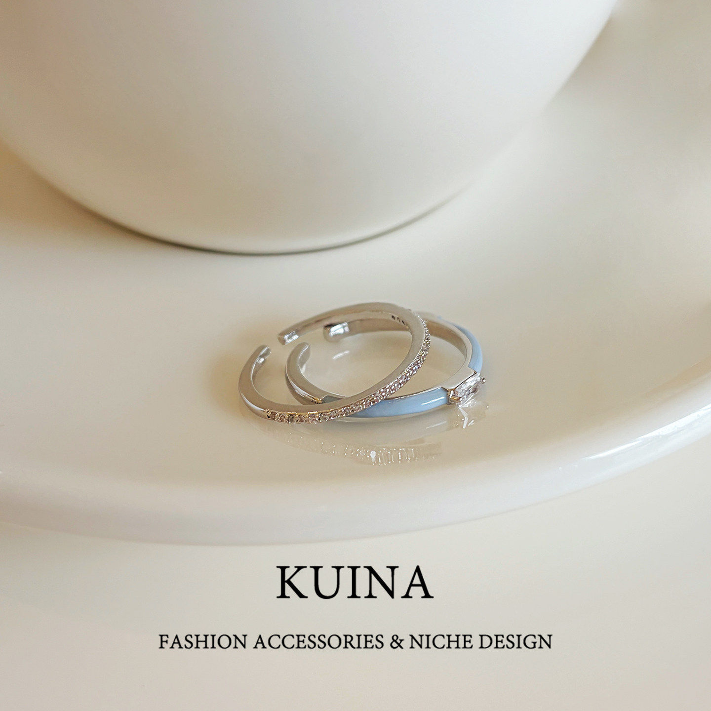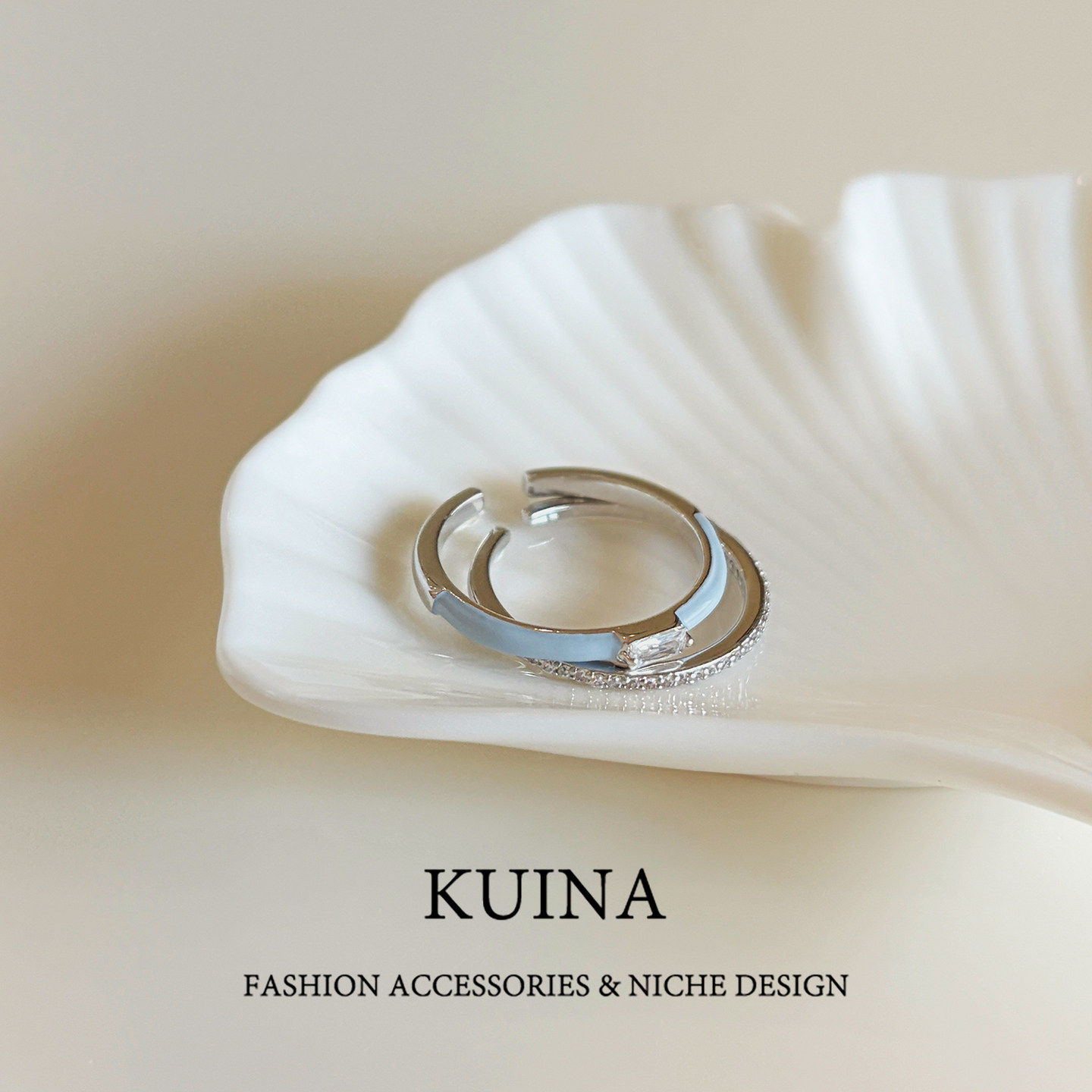 珐琅闪钻蓝色开口戒指女款套戒小众设计夏日叠戴指环简约素圈配饰