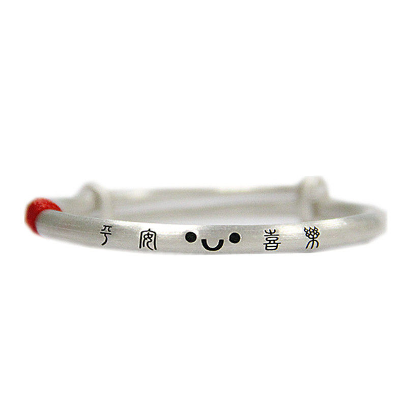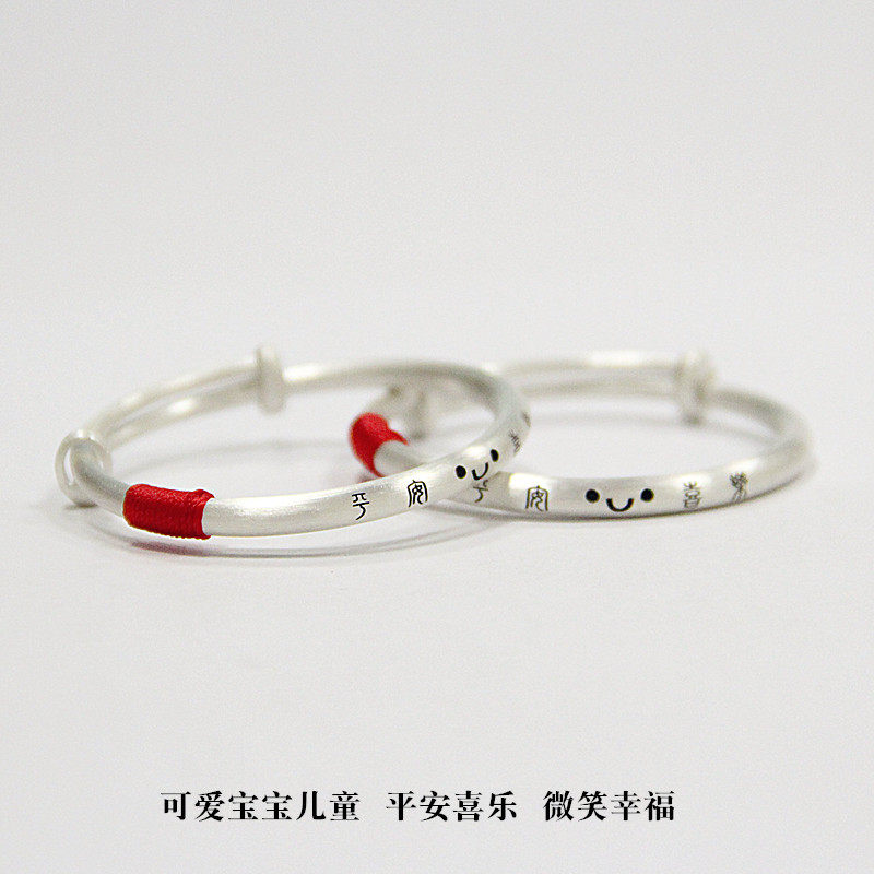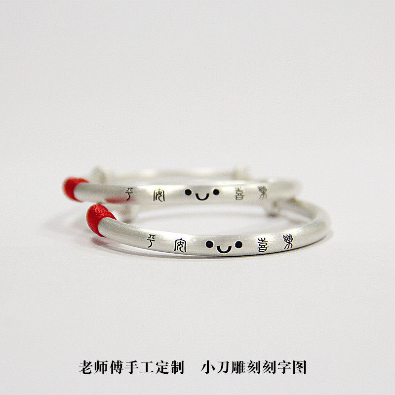 一对999纯银手镯平安喜乐微笑宝宝满月男女儿童小篆足银镯子刻字