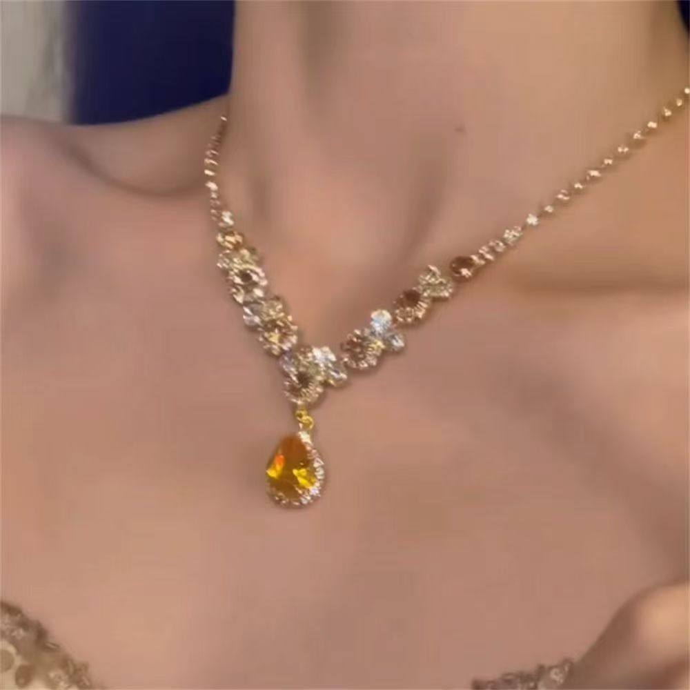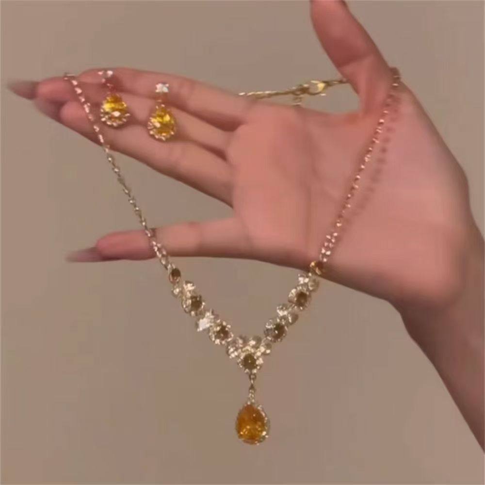 爆闪黄色水滴吊坠项链耳环套装贵气高级感晚宴礼服锁骨链轻奢耳饰
