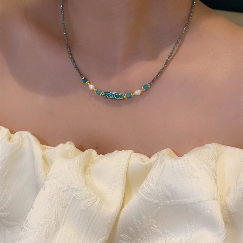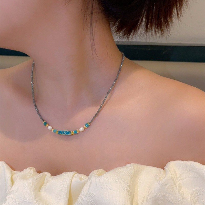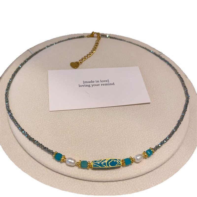 小红书时尚清新绿色磷灰石项链淡水真珍珠拼接锁骨链复古毛衣链