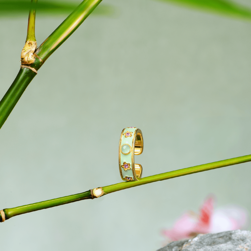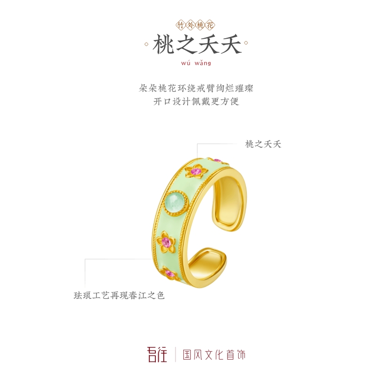 吾往桃之夭夭珐琅玉石戒指新中式中国风桃花开口指环绿色复古手饰