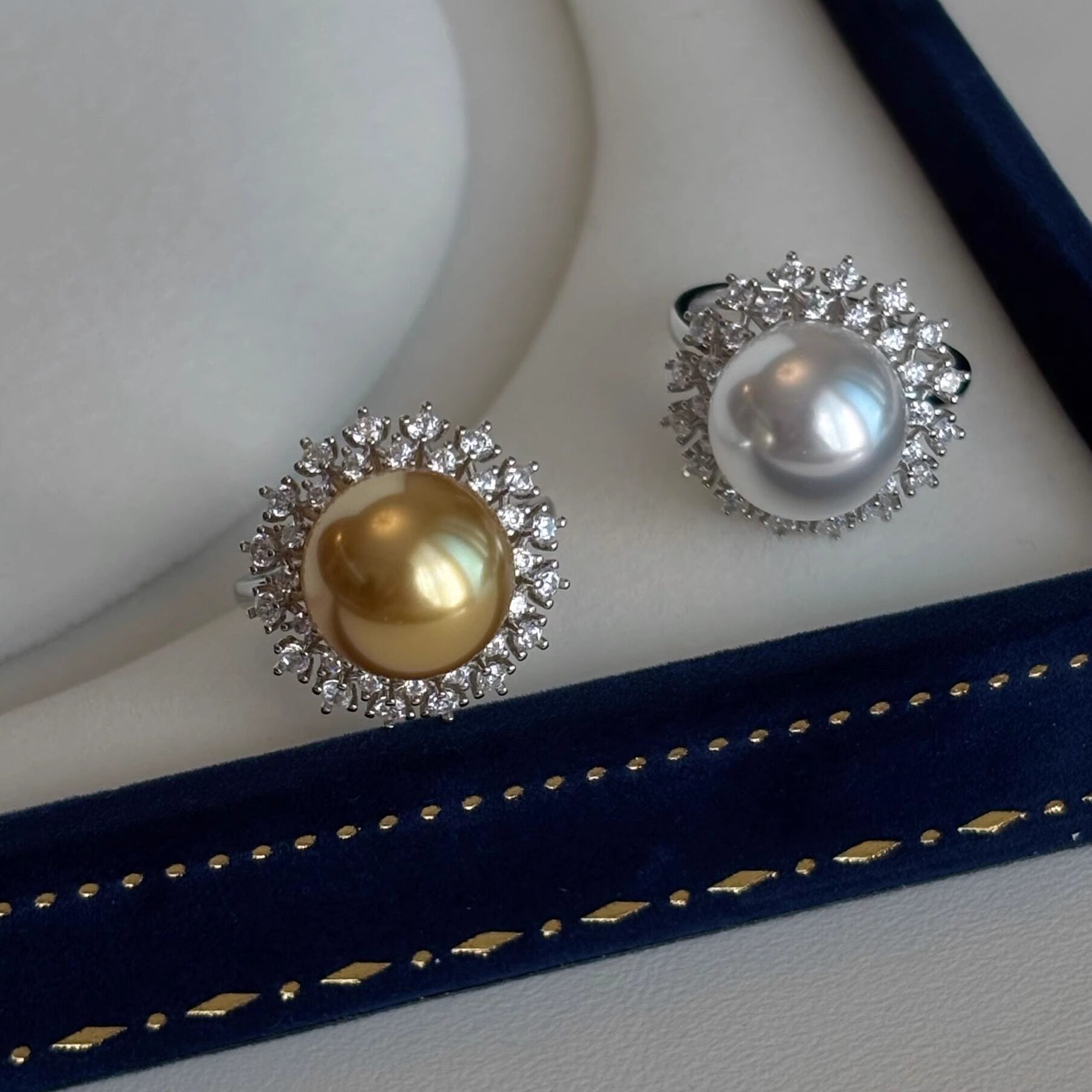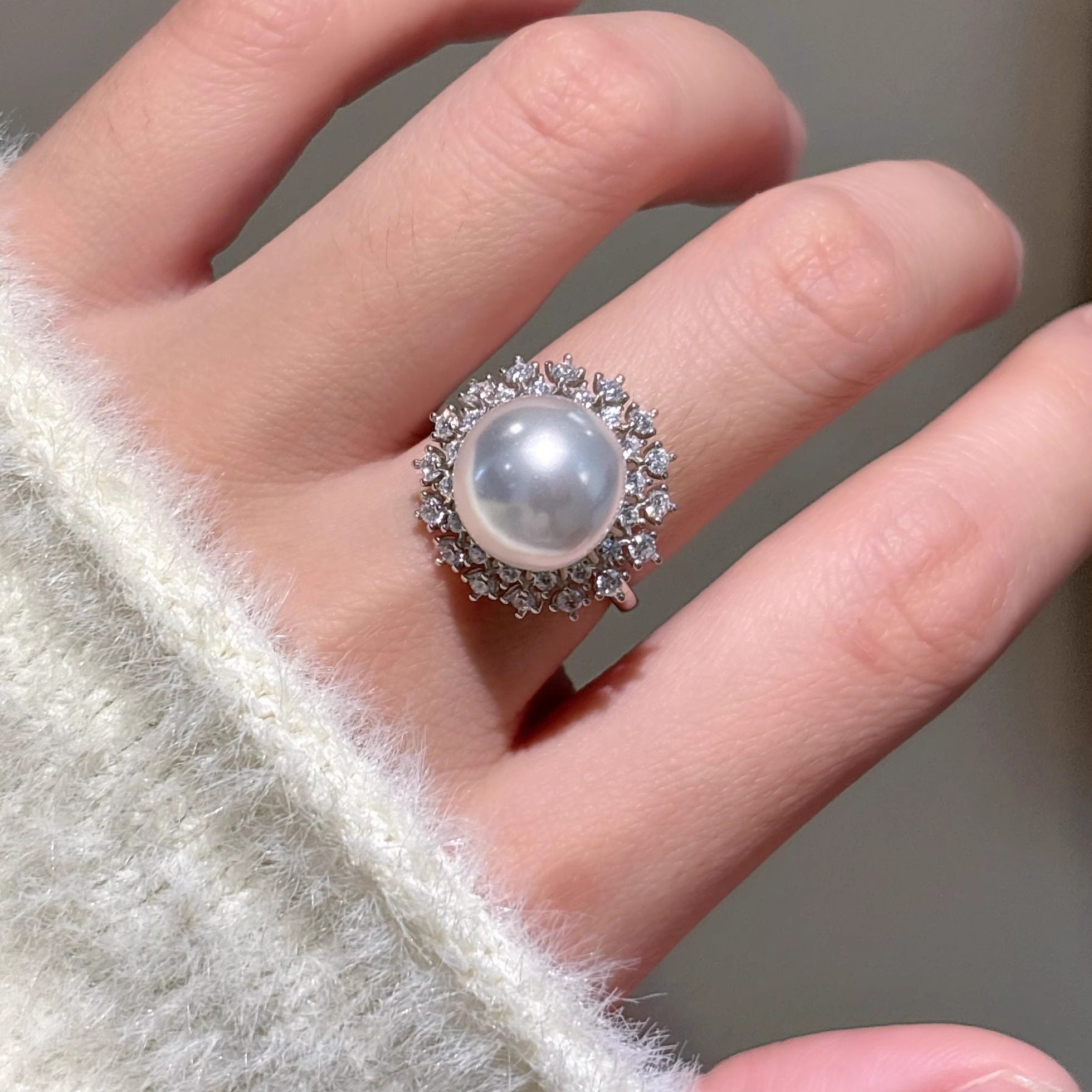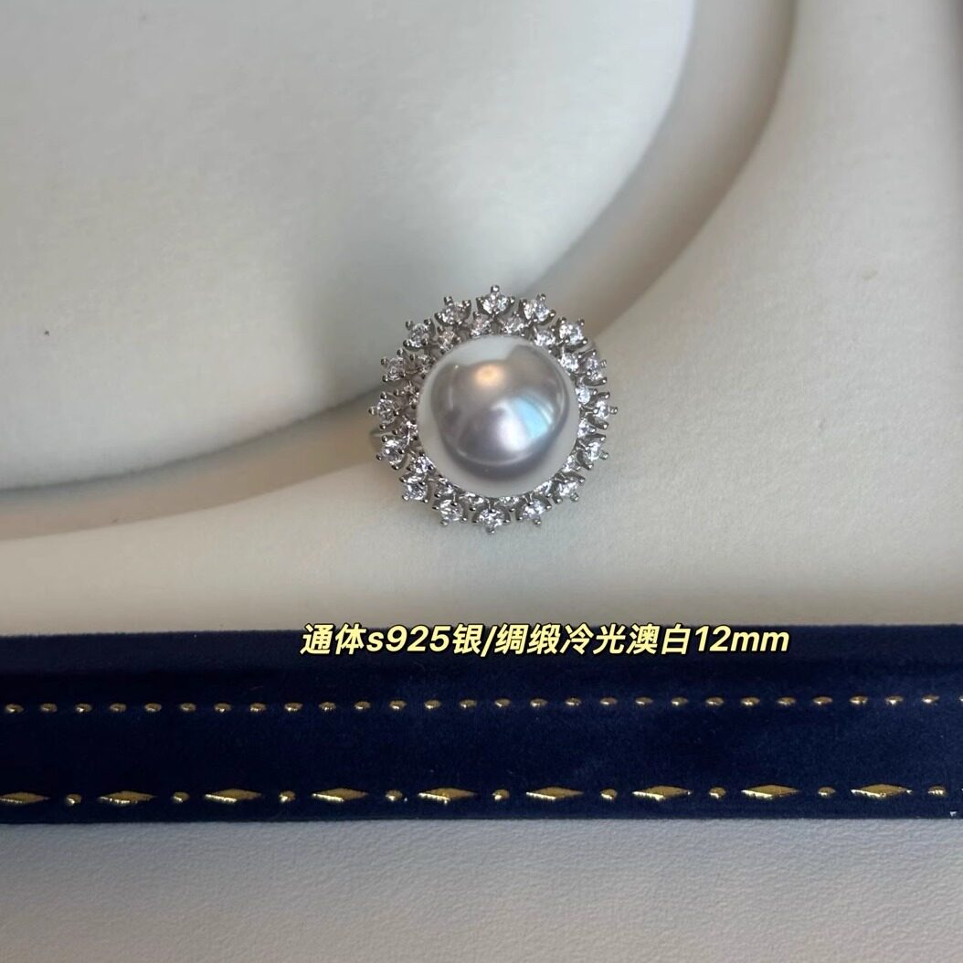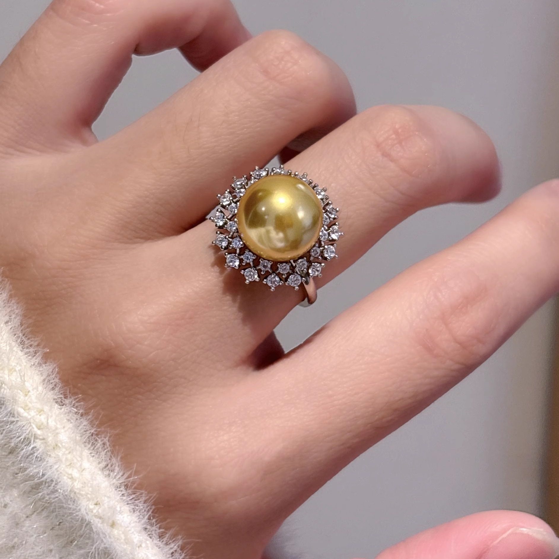 高级感贵气人造澳白南洋金珍珠大珍珠太阳花戒指s925纯银开口指环