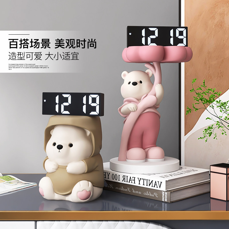 奶油风熊时钟摆件客厅玄关卧室床头钟表台式摆放式桌面智能电子钟