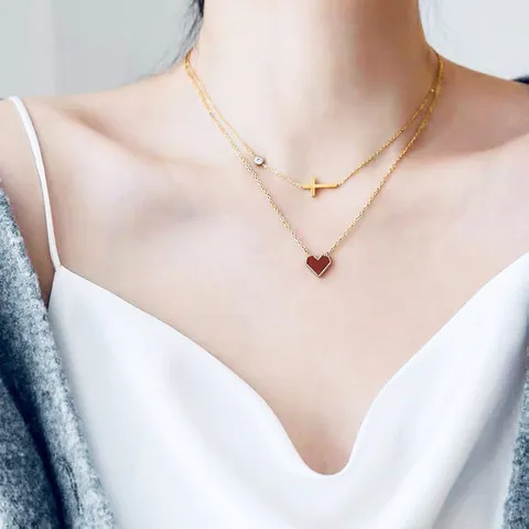 叠戴2022年水晶设计感十字架项链小众锁骨链红色爱心新款高级红心