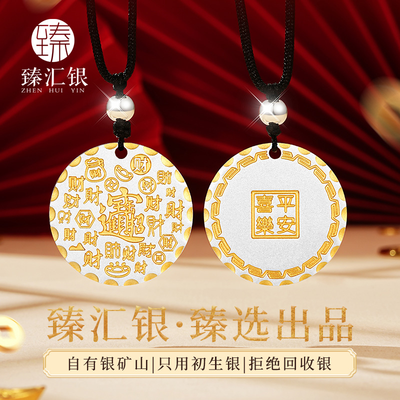 臻汇银纯银描金福牌吊坠男女款足银999吉言无事牌银项链生日礼物