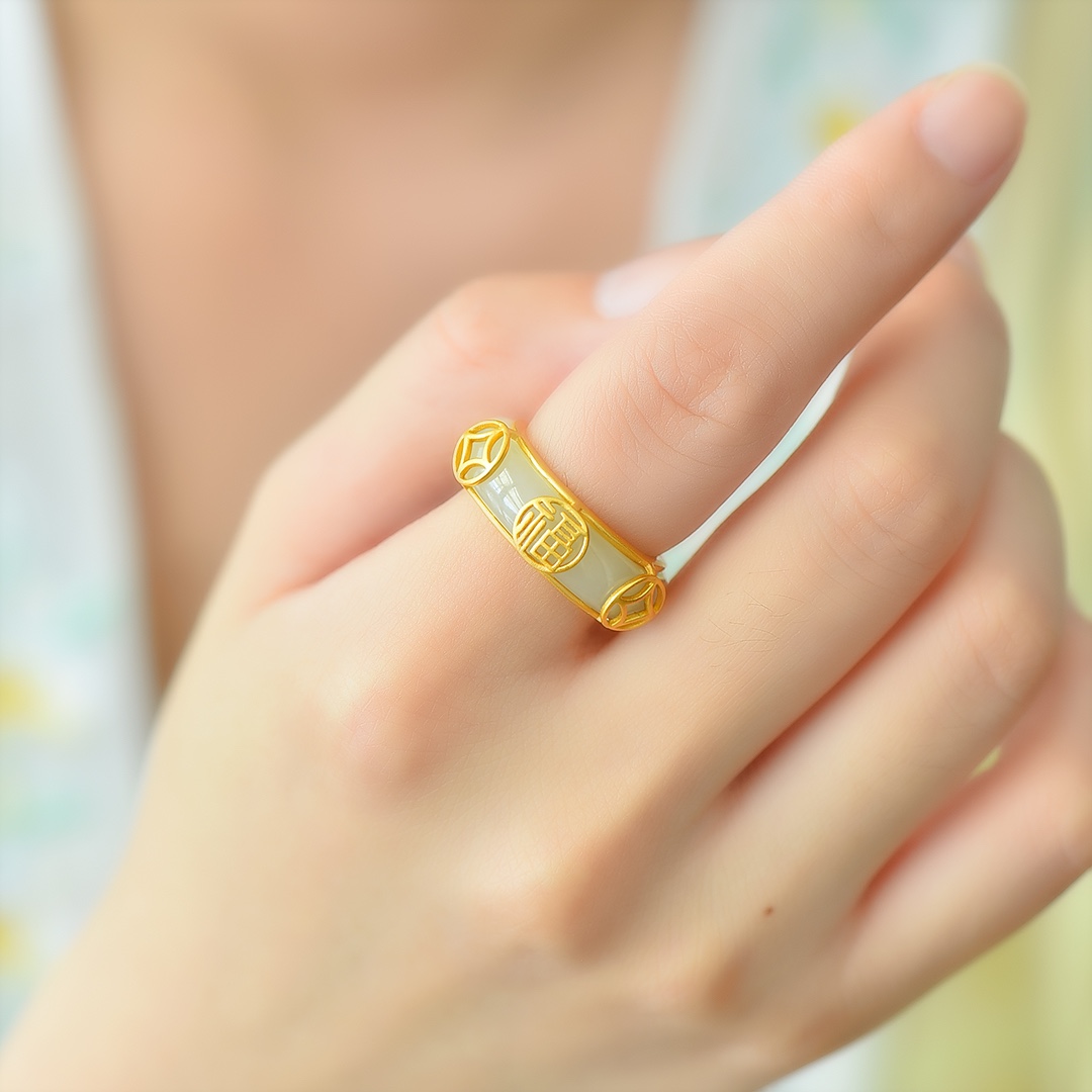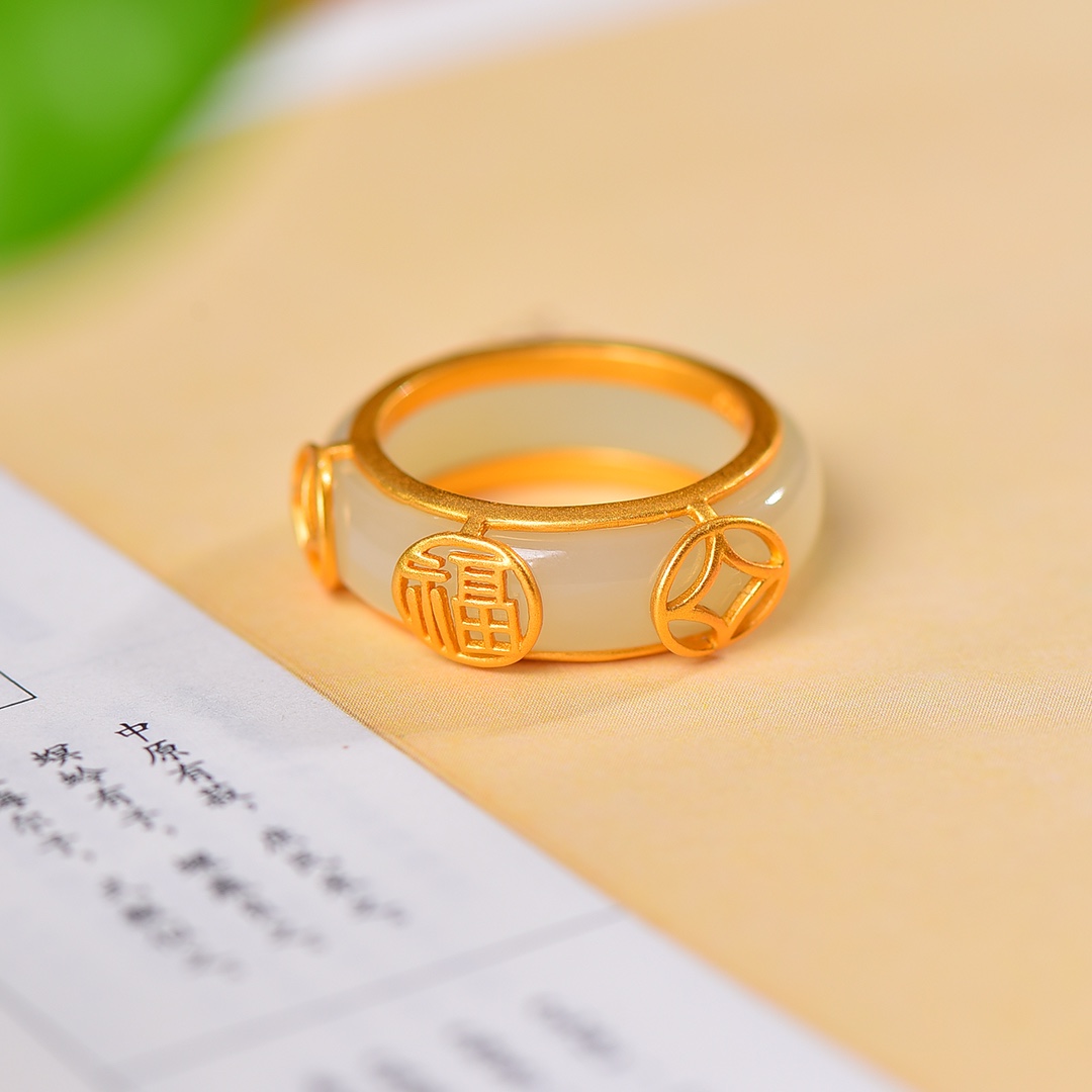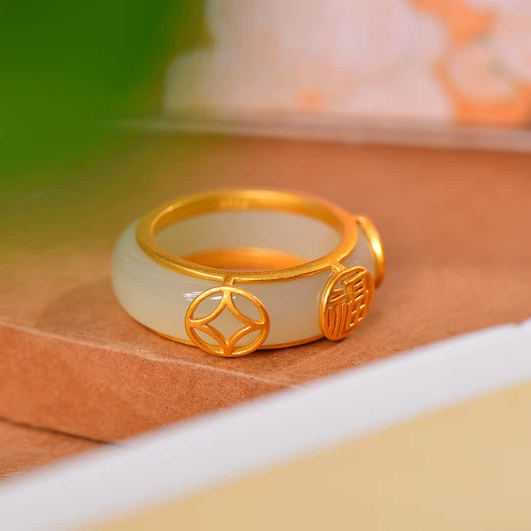 S925银镀18K金镶和田玉白玉福字跑环女复古吊坠玉坠项链戒指两戴