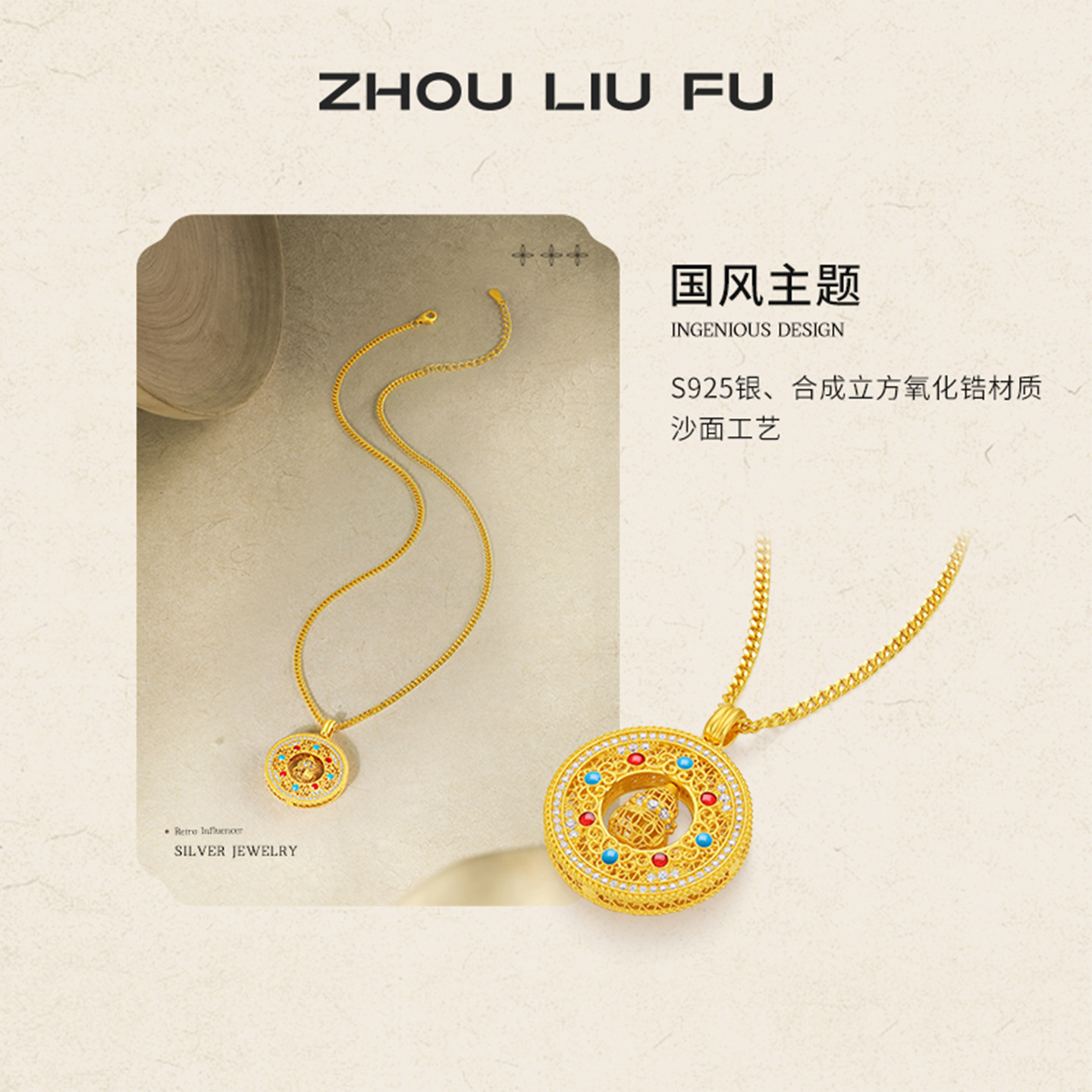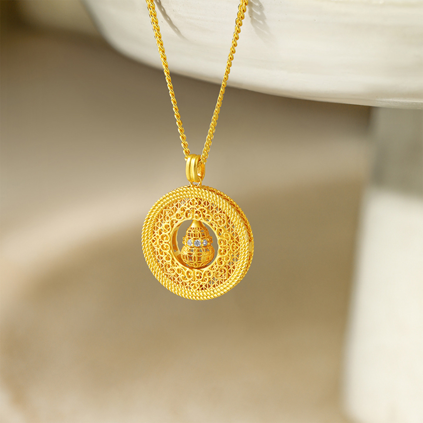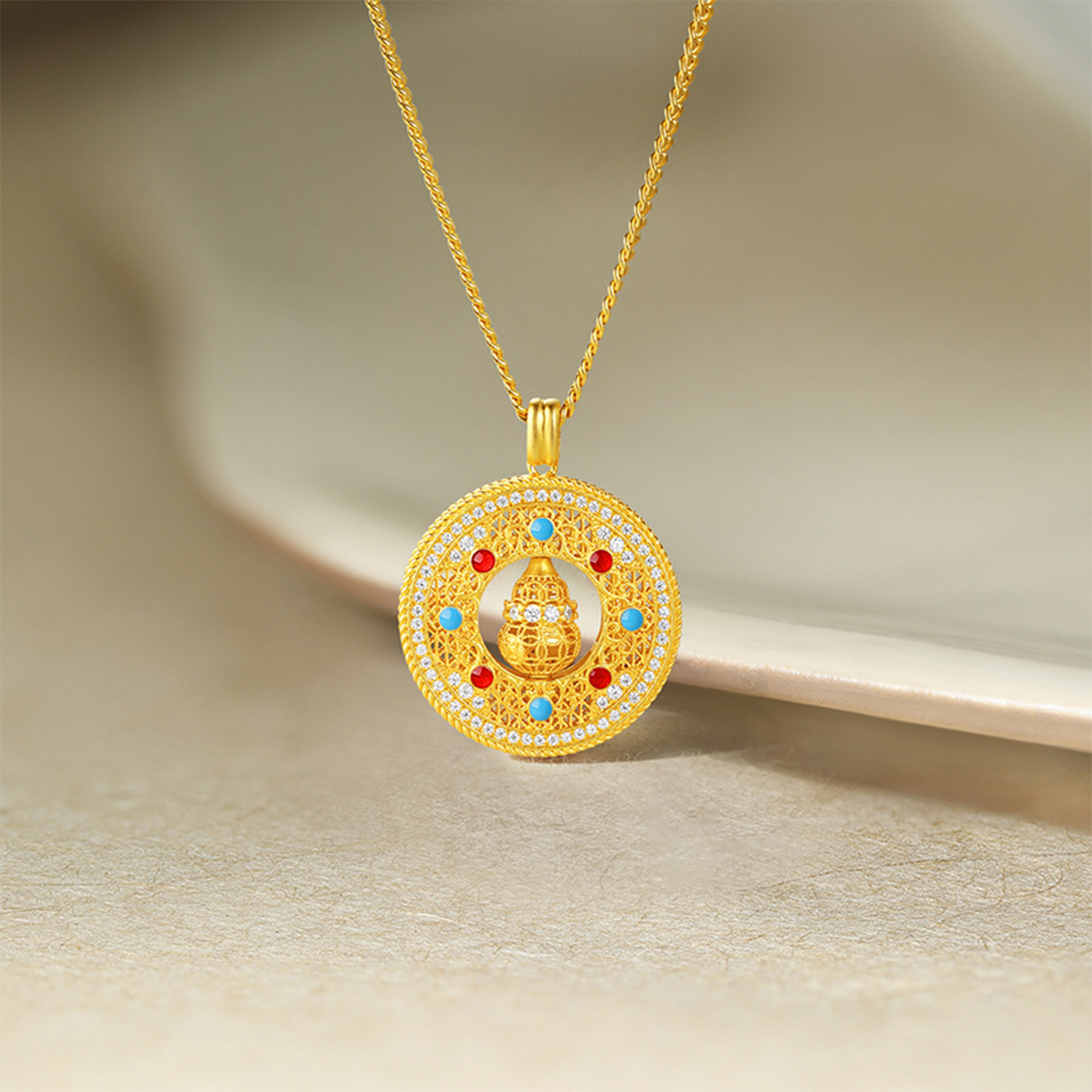 周六福葫芦八宝罗盘项链女S925银链坠黄金色小众节日礼物送女友
