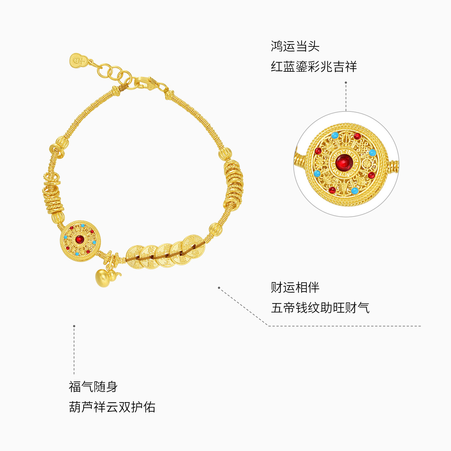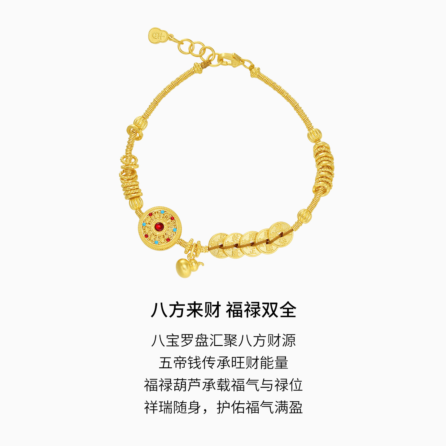 潮宏基臻金八宝罗盘黄金手链足金手串手饰古法金鎏彩五帝钱 卟