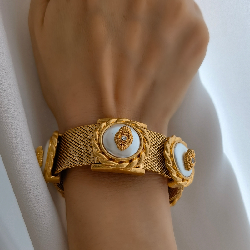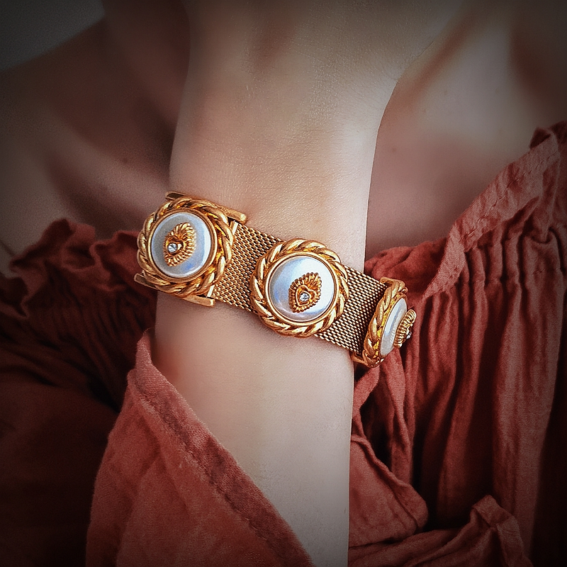 欧美小众中古质感表带哑光纽扣珍珠手链法式轻奢重工桃心可调手饰