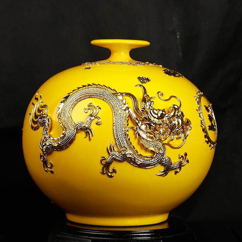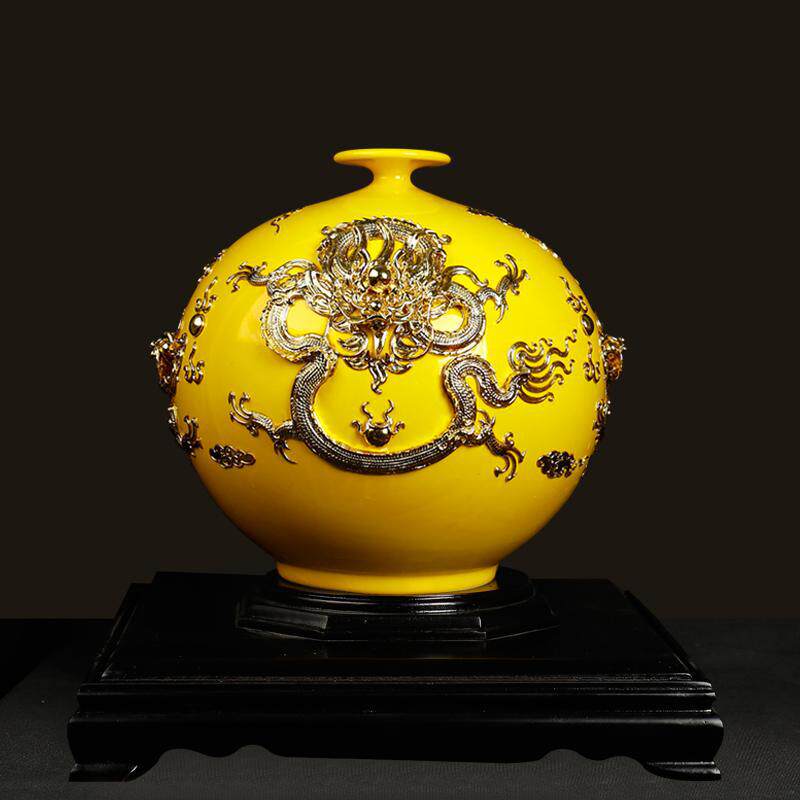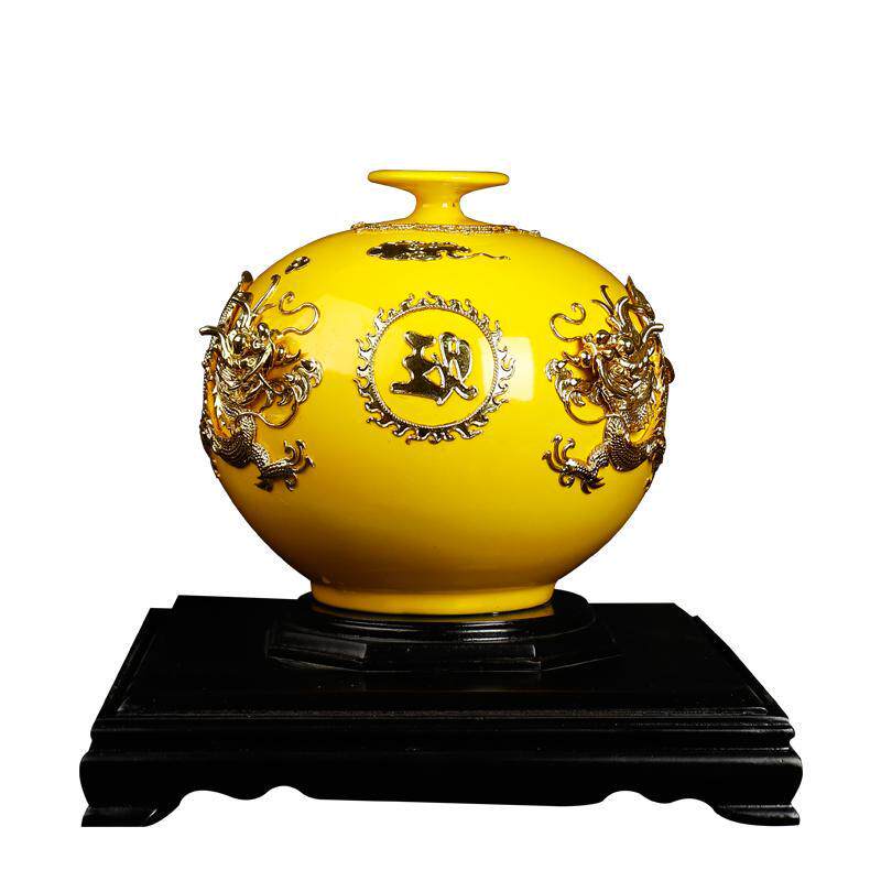 陶瓷瓷玄关商务送礼礼品手工工艺品摆件黄色天地方圆瓶子漆线雕客