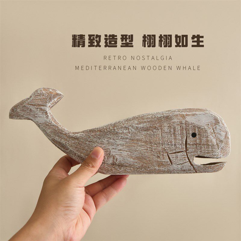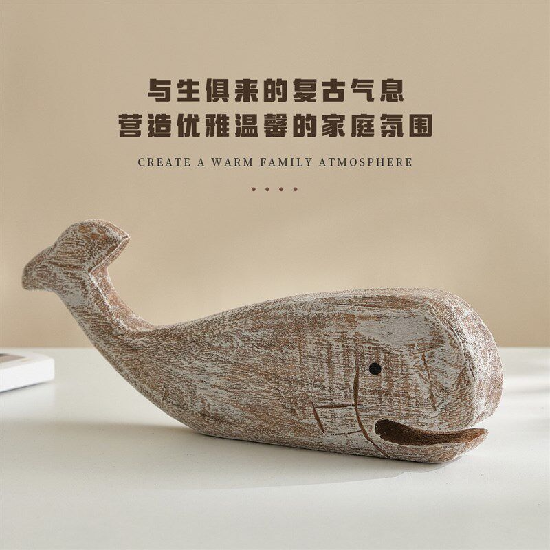 海洋风实木手工雕刻鲸鱼摆件地中海桌面摆设样板房软装电视柜摆台