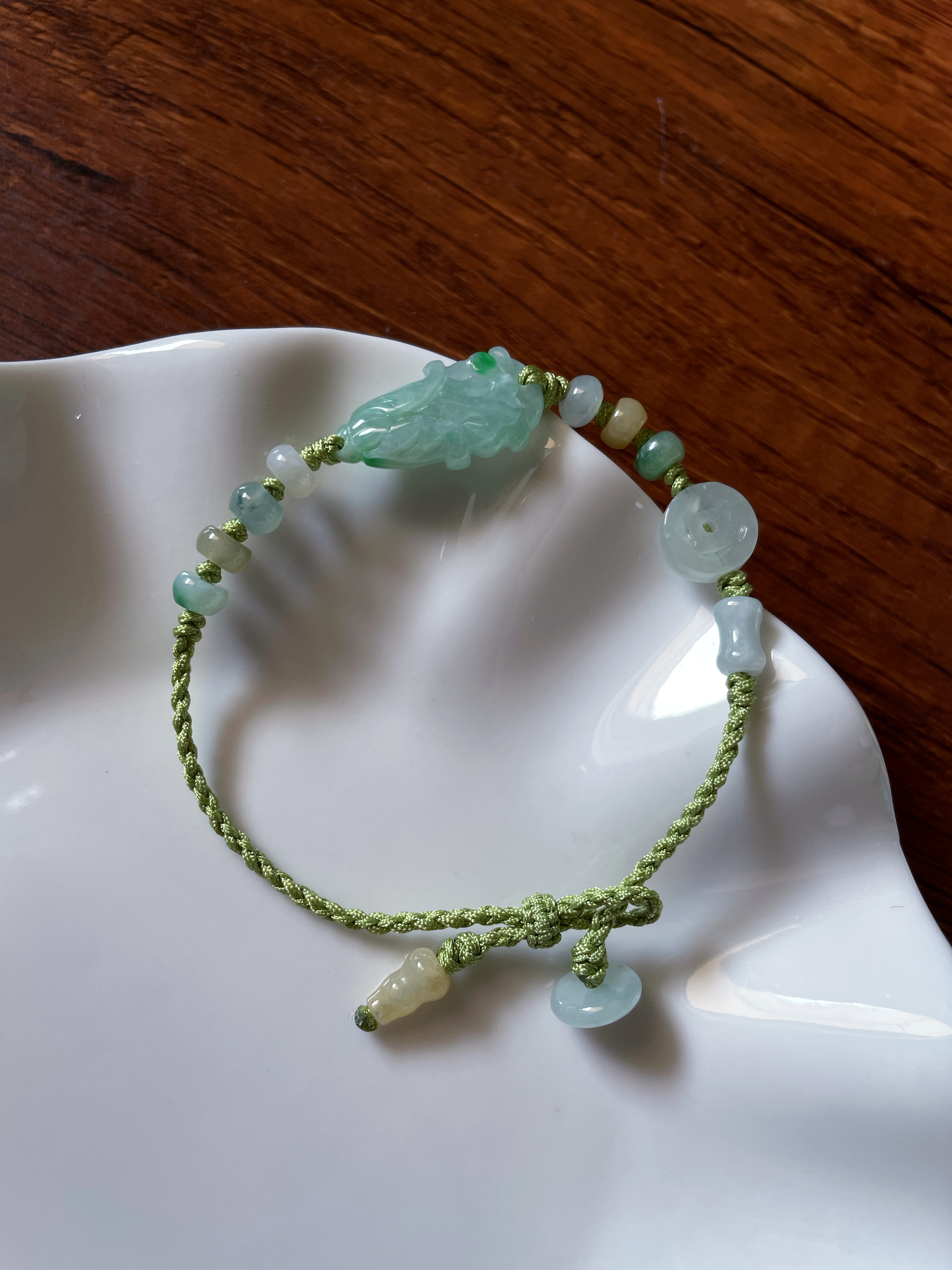 特色招百生财飘绿雕刻小白菜手牌天然a货翡翠清新手绳手链可调节