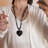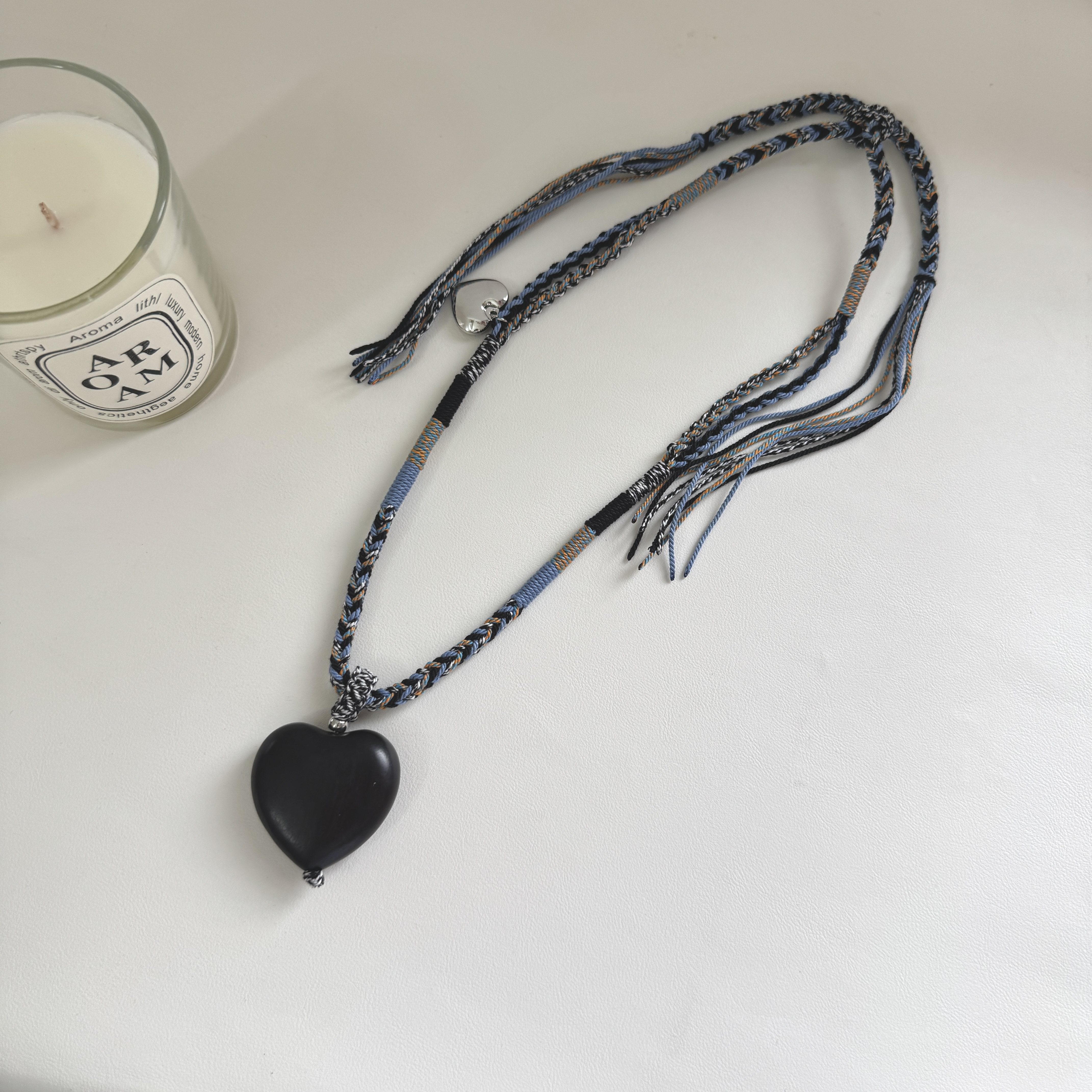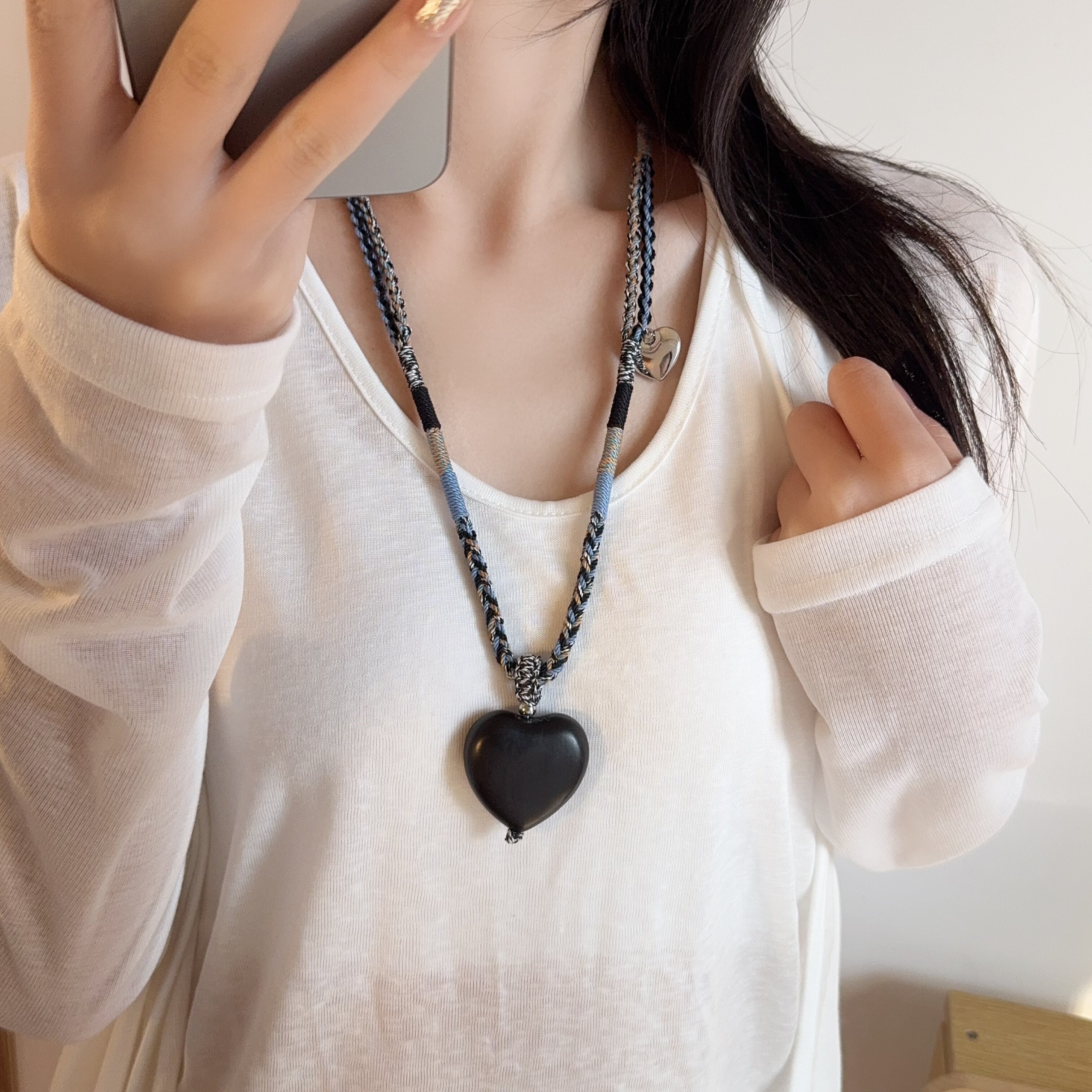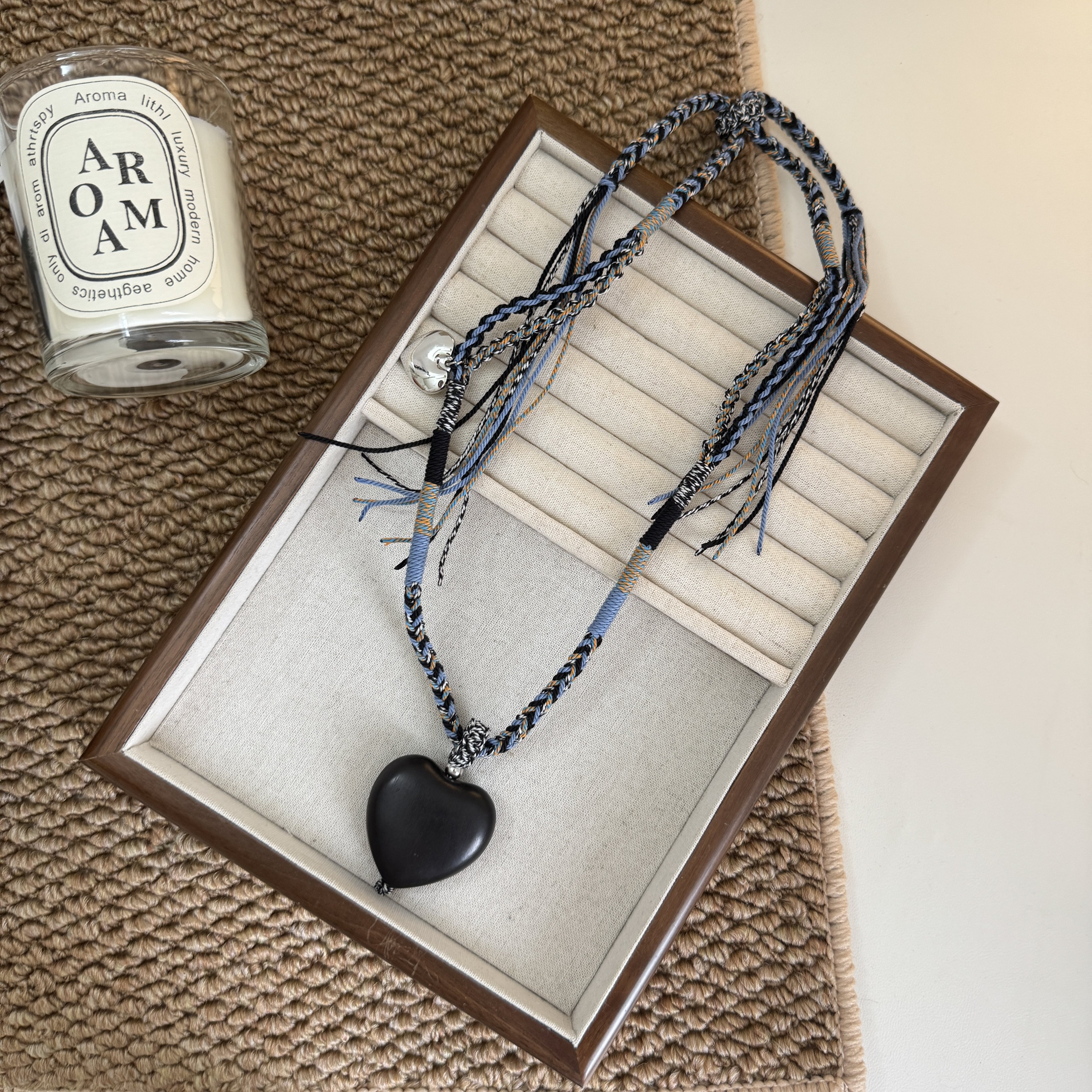 新中式黑色木质爱心吊坠编绳项链长款女气质高级感百搭简约毛衣链